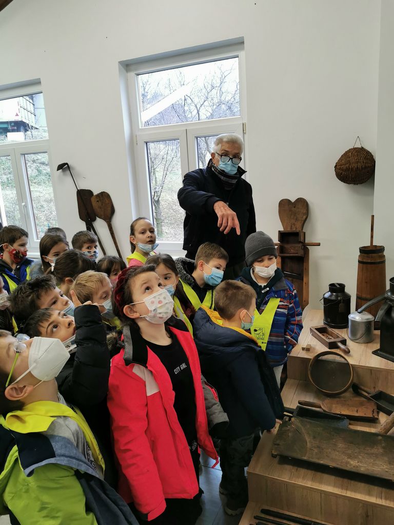 Najprej smo si v pritličju ogledali stare razstavljene fotografije, ki jih je gospod Edo za muzej pridobil od vaščanov. Otroci so se čudili, ker so bile vse »črne in bele in rjave«, povsem drugačne od današnjih. Že na stopnišču smo lahko občudovali prve in tudi najstarejše ohranjene predmete. Mimo velike makete prikaza vaškega potoka, mlinov, žag in luščilnic ječmena smo se pomaknili do dveh večjih razstavnih sob s številnimi starimi predmeti, starimi sto in več let, ki so jih uporabljali v kmetijstvu, gospodinjstvu ter raznih obrteh. Otroci so radovedno sledili pripovedovanju zanimivosti in opisovanju predmetov ter vedno zraven še kaj vprašali. Navdušeni so bili nad vsem, kar so videli in verjamem, da bomo v tem tednu veliko lažje kot sicer spoznavali življenje nekoč.