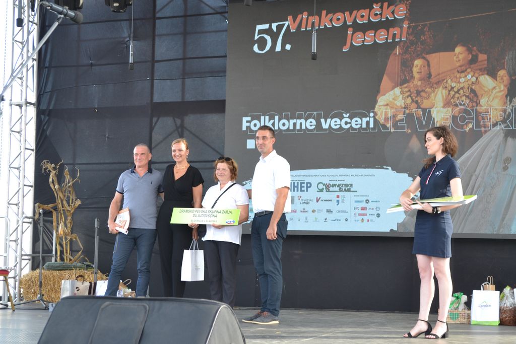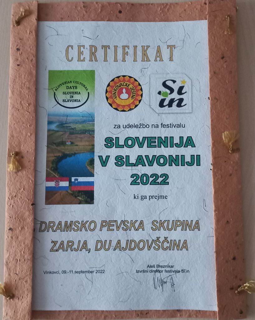 Nastanili smo se v hotelu Slavonija in v popoldanskem času že odhiteli na prizorišče prvega festivalskega dne.Vse skupine iz Slovenije – 20 skupin je prejelo tablo in certifikat o nastopu. Podelili so jo organizatorji in podžupan mesta Vinkovci. Nastopala je prva polovica skupin in navdušila vse prisotne.