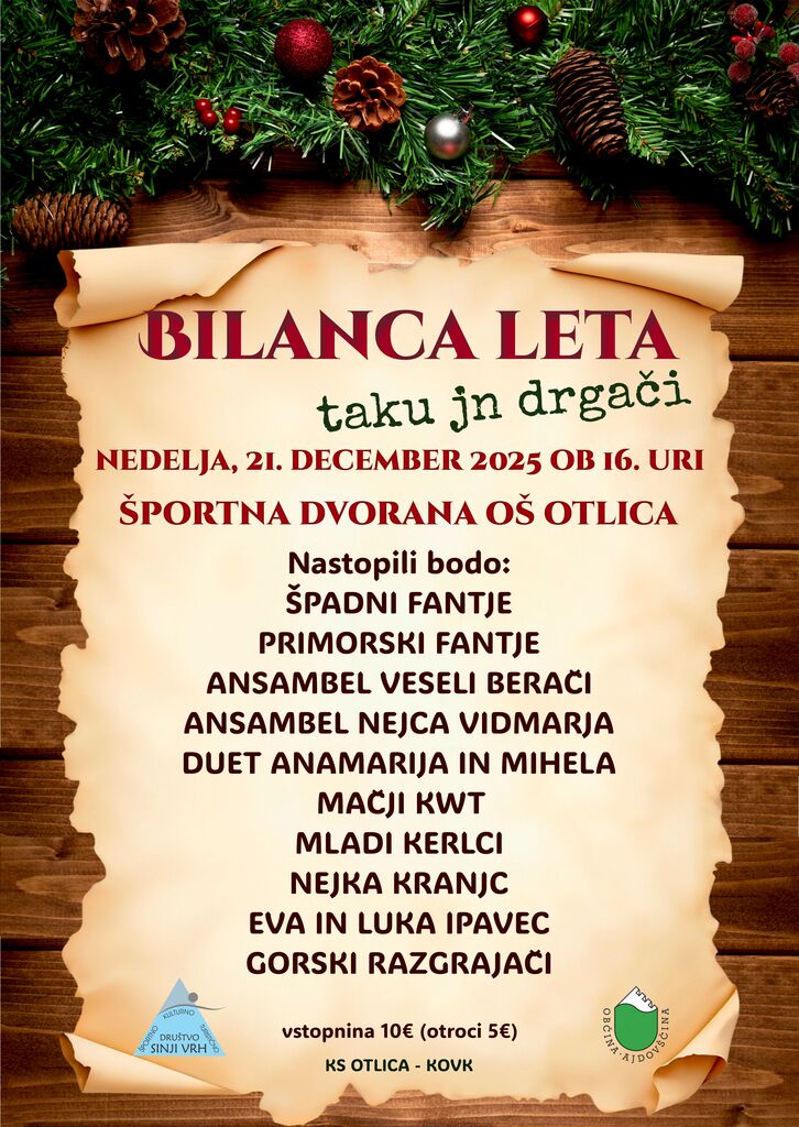 Vsi, ki imate radi glasbo, dobro družbo in pristno domače vzdušje, ste prisrčno vabljeni v športno dvorano osnovne šole na Otlici, v nedeljo, 21. decembra ob 16. uri, da skupaj obeležimo deseto Bilanco leta taku jn drgači. Naj bo to lep uvod v praznične dni – se vidimo na Otlici!