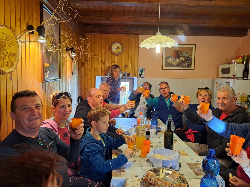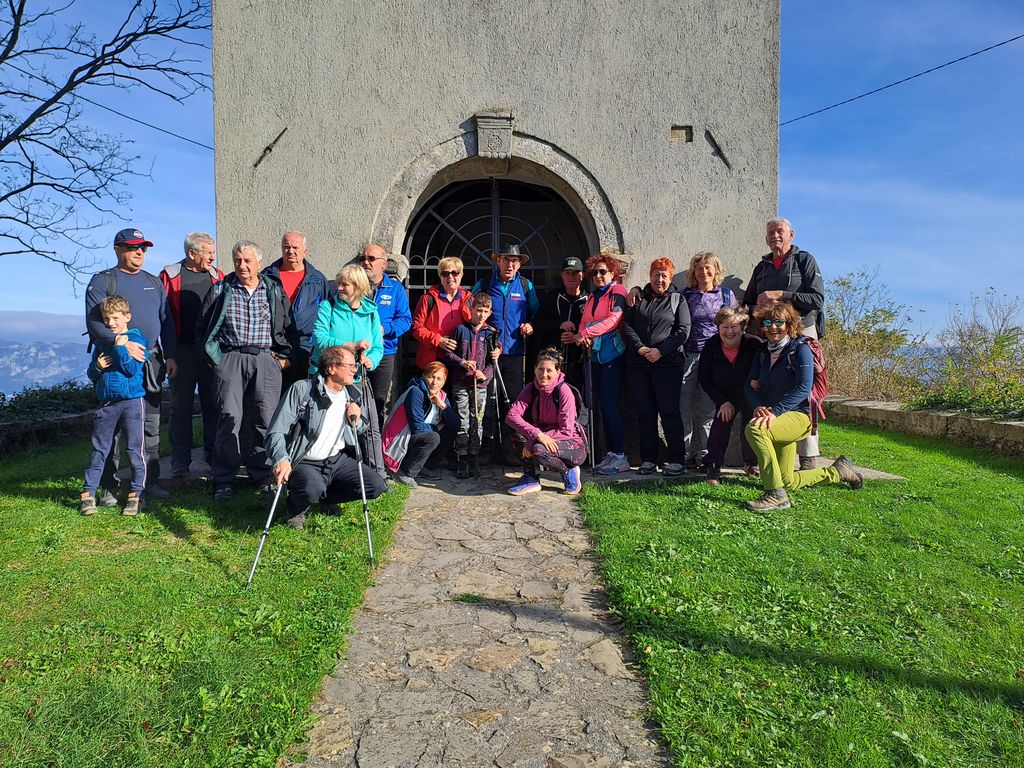 Nadaljevanje je bilo po stezi navkreber (z lepimi razgledi po dolini ter okoliških gričih Krasa) proti zaselku Sveti Martin, kjer je bila končna točka pri Žorževih pri cerkvi. Sanja in Janko, ki sta tudi člana DEŠK-a, sta pogrnila mizo in nanjo tudi postavila dobrote za utrujene duše, ki so potrebovale okrepčilo. Niso se pozabili postaviti tudi pred objektiv in pokazati kako lepa družba so …