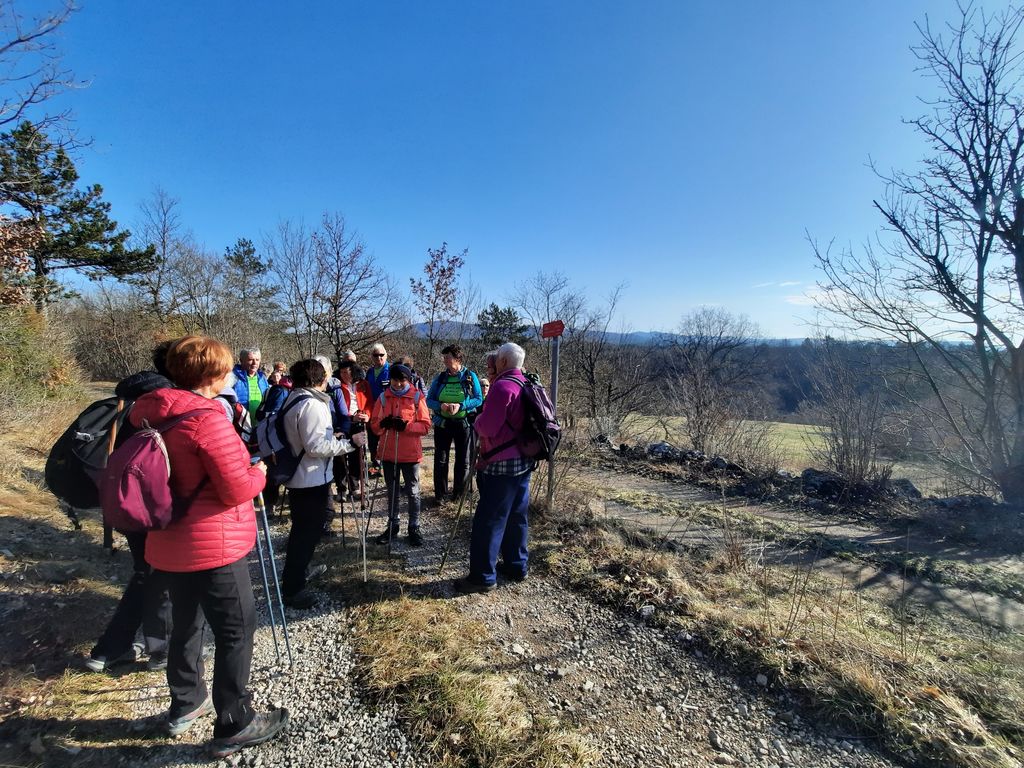Veselili smo se že v Ajdovščini za starim mlinom, ko nam je Boža – ena od treh – sporočila, da je zgodaj zjutraj postala prababica. Slika bele štručke z rumeno kapico v naročju ponosnega očka nas je raznežila. Pa smo se hitro razporedili po avtomobilih in se odpeljali do Kozine, počakali na znanca Alčideja, mu sledili v Hrpelje. Vozniki so uspešno rešili zadrego s parkiranjem in že smo vzeli pot pod noge. Saj nam kaj drugega tudi ni kazalo, mrzel piš nam je šumel zgodbo o zimi. Najprej smo šli skozi naselje mimo 'gostilne na Vasi', mimo table za lovsko trgovino, mimo velike 'štirne' in mimo table z zemljevidom o naravoslovno-zgodovinski učni poti, kar naprej, naprej … mimo psa, ki je z glasnim lajanjem opozoril na svojo lepo dlako, in drugega psa, ki je skoraj plezal po ograji svojega pesjaka, do široke makadamske ceste. Prav prijetno smo kramljali med sprehodom po ravnini in malo navzdol, med nabreklimi popki na drenovih grmih v siju dopoldanskega sonca. Našo pozornost je pritegnilo delno obnovljeno in ohranjeno zidovje Rudetove ledenice, dokaz, da so tu vodile poti in železnica proti Trstu in Reki. Na prvem razpotju smo zavili navzgor po kamnitem kolovozu v smeri Slavnika. Vodič nam je pokazal razgled na Ajdoščino (ne našo Wajdušno!!) in lahko smo pomahali Babi in Babcu pod Rodikom. Zlagoma smo se vzpenjali, imeli dovolj moči za klepetanje, za šale in nasvete in smeh. Tudi to je bogastvo četrtkovih pohodov: več glav več ve, več ljudi ima več izkušenj in znanja, ki ga dobrohotno delimo med seboj, se nasmejemo in tako zaužijemo nekaj pilul za dušo. Dva ducata ljudi dovoljujeta dovolj sogovornikov – z vsakim niti ne utegnemo - in široko paleto pogovorov.