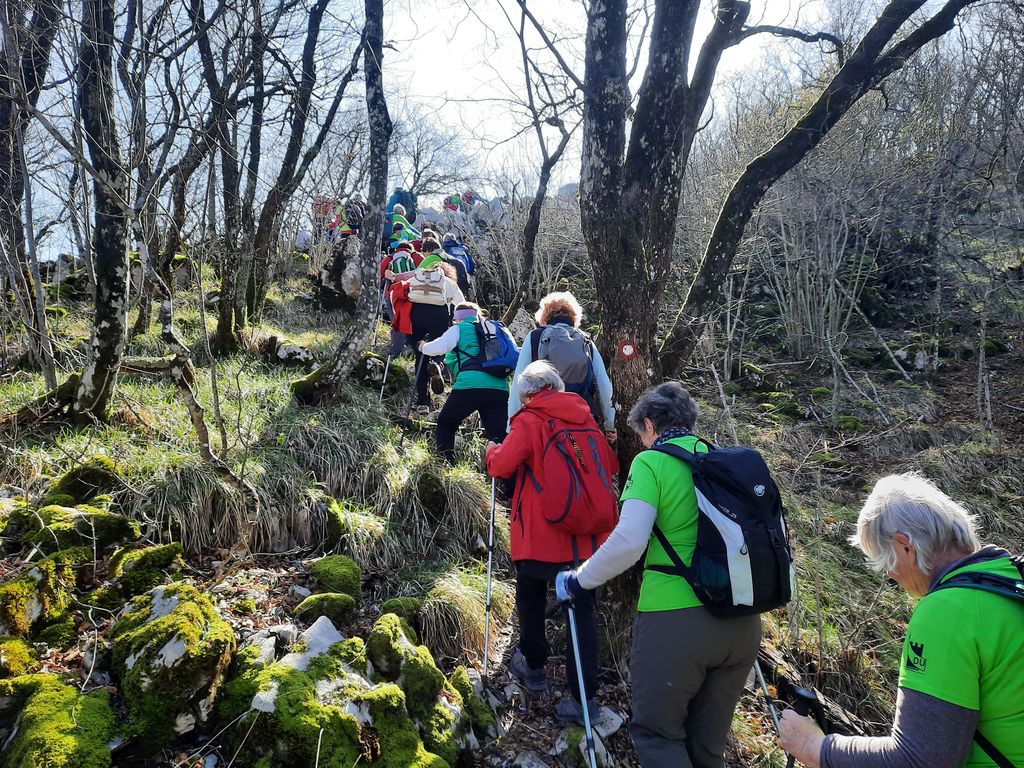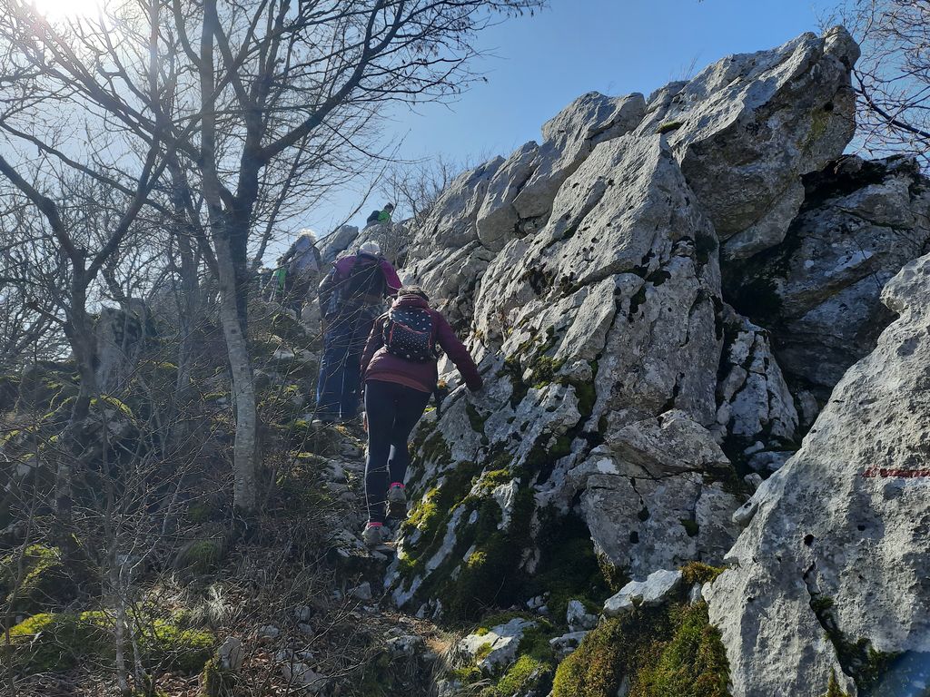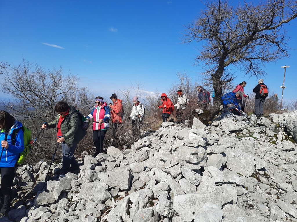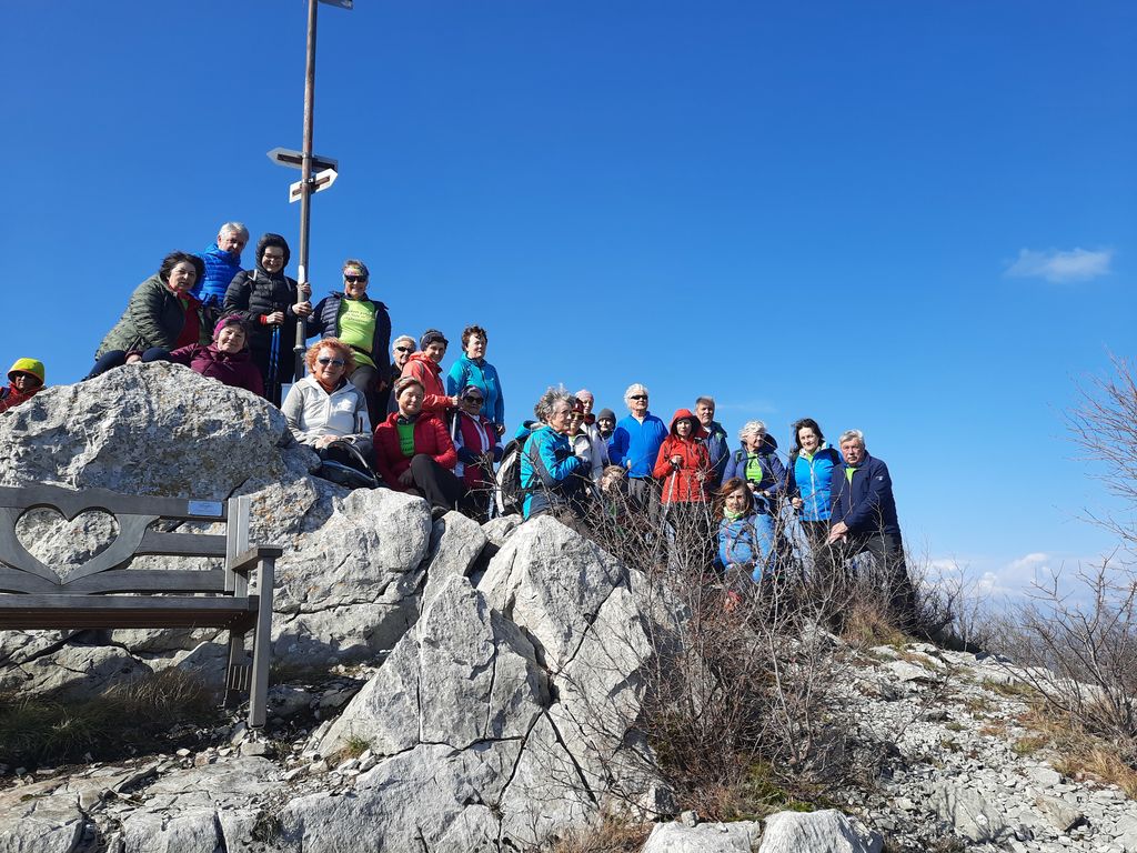 Kolovoz nas je pripeljal do mehke široke steze v redek kraški gozd. Ob lovski preži smo zavili desno in se po 'strmi' stezi vzpenjali proti vrhu te dobrih 700 metrov visoke gore. Steza je vodila po suhi travi med z mahom poraščenimi kamni do nekakšne globeli pod vrhom. Tu pa doživetje kot se za pravo goro spodobi: v skale in med skale postavljena in vklesana steza je zahtevala natančne stopinje, glave je hladil mrzel veter. Tik pod vrhom je klopca, na vrhu pa kovinski steber (palica) z vpisno skrinjico in smerokazi. Od tu se pohodnikom odpira čudovit razgled do morja, preko Vremščice, Nanosa, pravijo, da tudi do Triglava. S tem so se ukvarjali predvsem moški, me smo si vzele čas za malico, za vnuke in pravnučko … vsi tudi za fotografiranje - veliko pohodnikov, veliko fotografov.