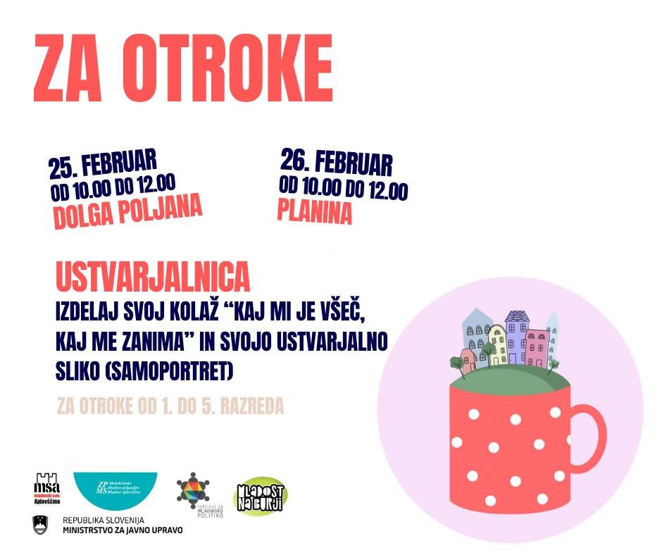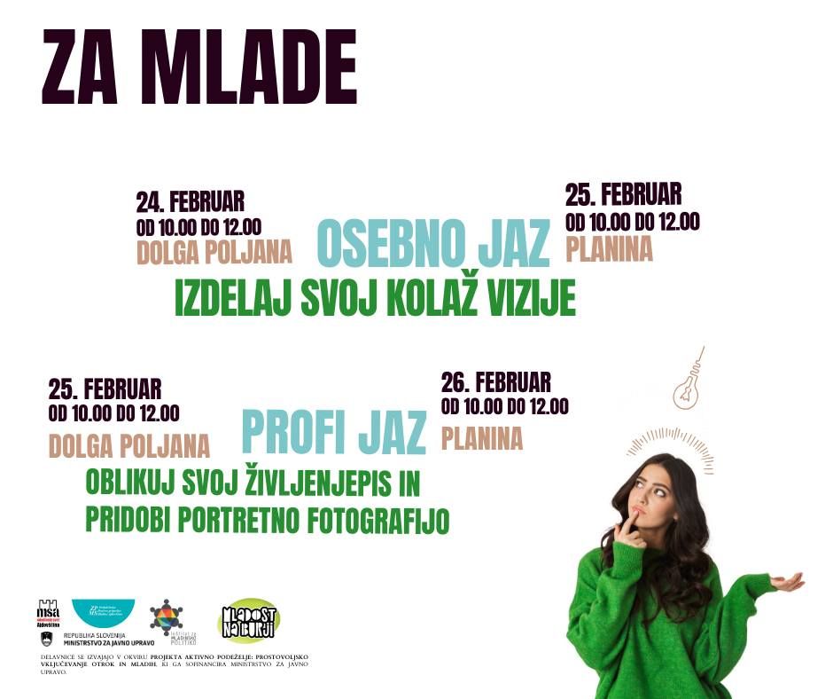 Med zimskimi počitnicami (od 24. 2. do 26. 2. 2025) bomo obiskali Dolgo Poljano in Planino. Za mlade (13+) pripravljamo delavnici "Osebno jaz" in "Profi jaz", za otroke (1. do 5. razred) pa ustvarjalno delavnico izdelave kolaža in samoportreta