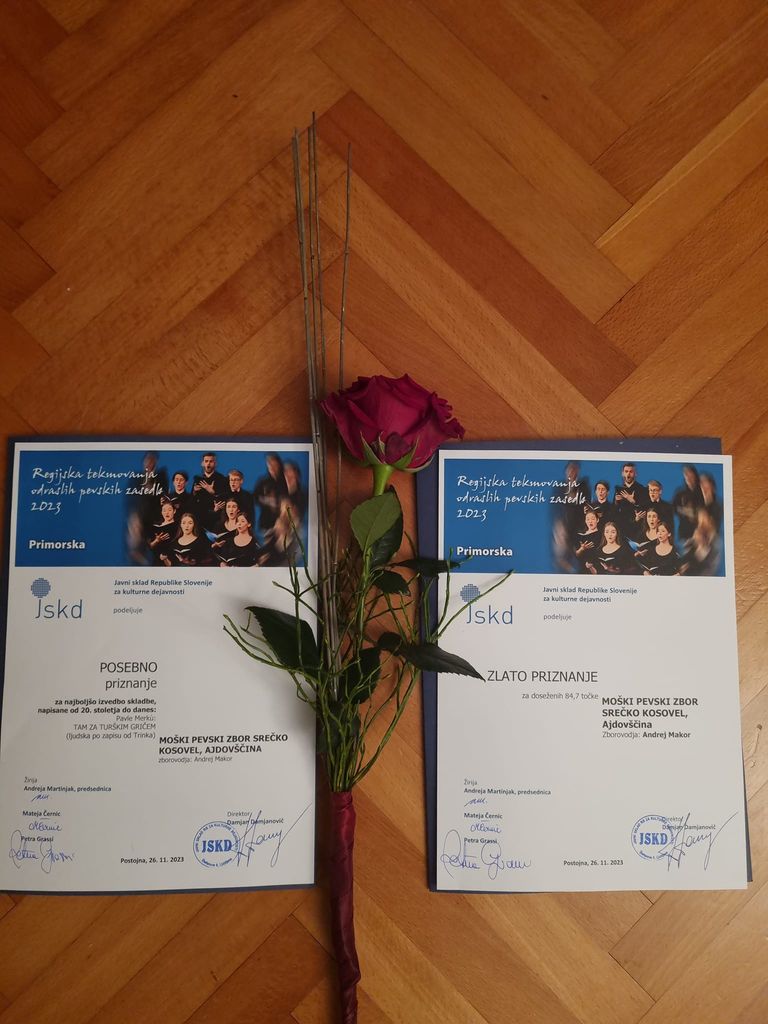 Mešani mladinski pevski zbor Srečko Kosovel se je pod vodstvom zborovodkinje Petre Habjanič Gregorc na Regijskem tekmovanju odraslih pevskih zasedb 2023, v nedeljo, 23. novembra, v Postojni, odrezal več kot odlično. Domov je prinesel zlato priznanje in priznanje za najbolj obetavno zasedbo tekmovanja.