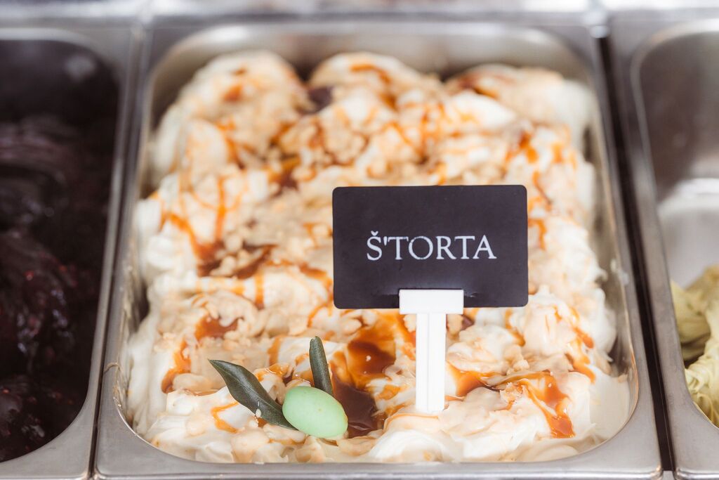 Sladoled Š'torta je navdušil z zgodbo, videzom, teksturo in uravnoteženostjo okusov lokalnih sestavin, sestavljajo pa ga mlečna osnova s kremnim maskarponejem in olivami, preliv iz karamele s piransko soljo in hrustek iz bele čokolade, bogatijo pa ga še zlate kaplice oljčnega olja iz oliv sorte Štorta Domačije Milok.