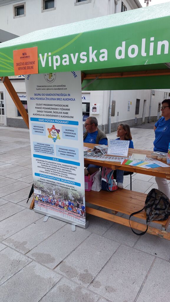 Naše društvo, Abstinent Vipavske doline, se je kot vsako leto do sedaj z veseljem odzvalo na vabilo k sodelovanju.Na svoji stojnici smo delili letake in ljudem povedali, kako naše društvo deluje, kako se včlaniti in kako začutiti, kdaj je tisti trenutek, ko je prav, da storimo ta korak. V predstavitvi je Damjan opisal društvo, način delovanja. Povedal je, da delujemo v terapevtskih skupinah, da imamo terapevtske sestanke enkrat tedensko, poleg tega pa se družimo tudi izven terapevtskih srečanj. Odprti smo za pomoč tudi novim članom, ki bi se radi odločili za abstinenco in se tako ponovno na polno vključili v družbeno življenje.