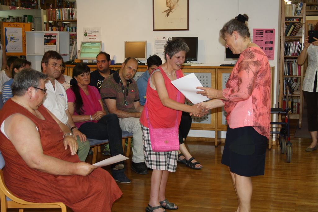Za popestritev in potrebe animiranja bralcev- varovancev v VDC smo pripravili tudi projekt KNJIGOŽUR. Iskala sem knjige, ki bi bile primerne za to ciljno skupino in izbrala 9 leposlovnih del, 10 del iz mladinske strokovne literature in 4 pesniške zbirke. Kolekcijo teh knjig smo v posebnem zabojčku postavili v obeh enotah VDC, v Ajdovščini in Vipavi. Sodelavec je oblikoval 8- stransko zgibanko, od tega je 6 strani namenjenih bralcu, da tja napiše ali nariše kaj o knjigi, ki jo je s tega seznama prebral. Sicer pa se s temi knjigami srečujemo tudi na naših mesečnih srečanjih. Že na jeseni smo se dogovorili, da bomo projekt zaključili v juniju, ko bomo na zaključni prireditvi podelili priznanja vsem, ki so redno zahajali na bralna srečanja in tudi sicer čez celo leto pridno prebirali in listali po knjigah. In podelili smo kar 28 priznanj!