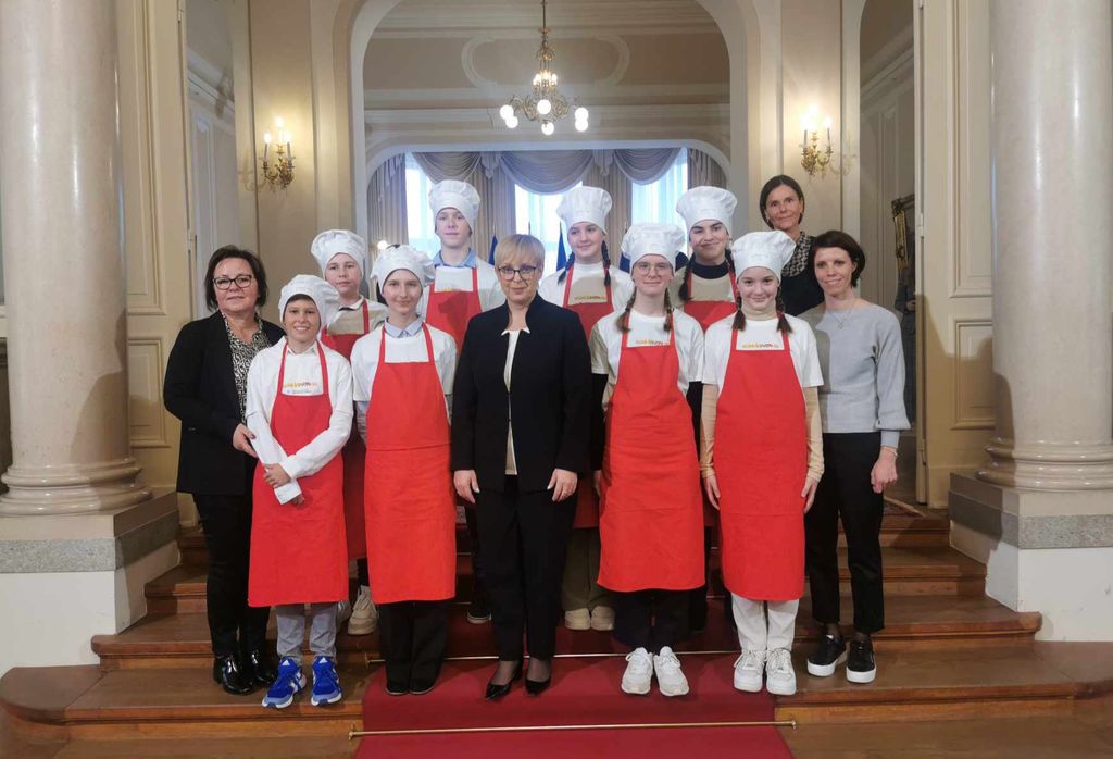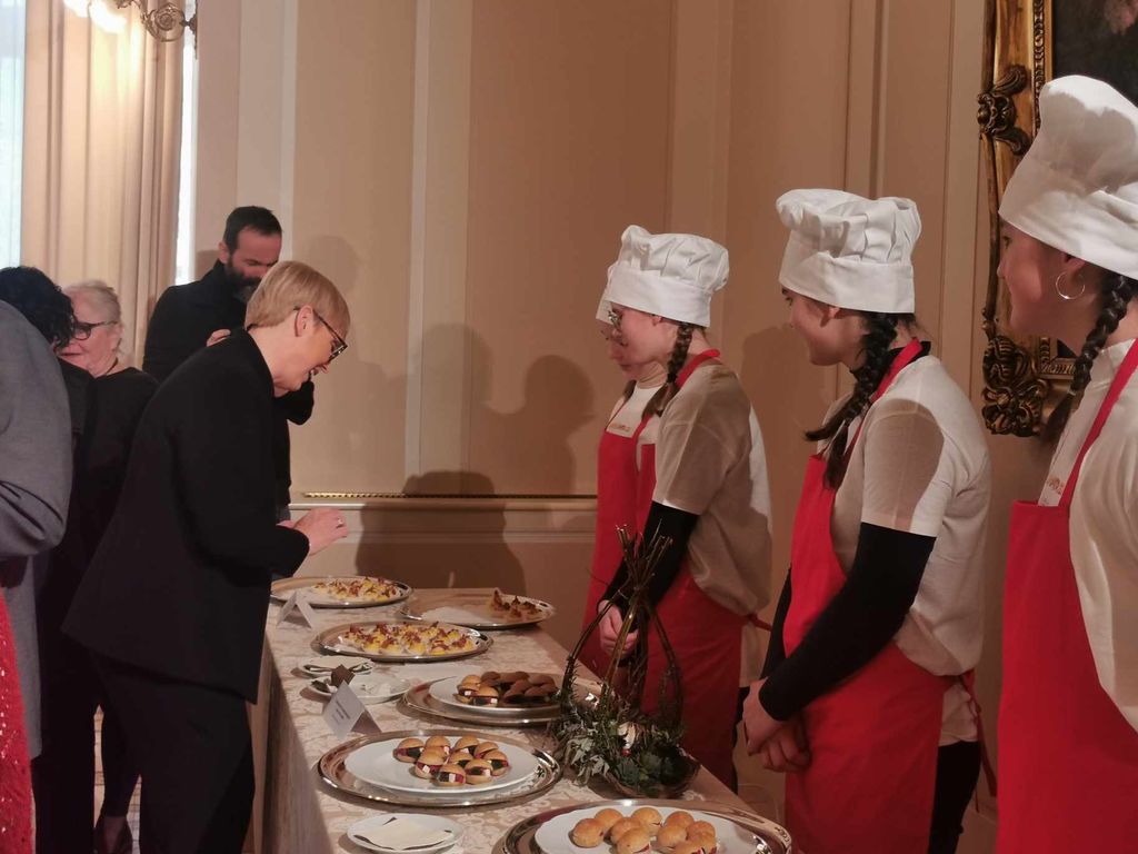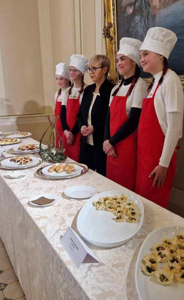 Z velikim ponosom, častjo in še večjo tremo so otroci izvedli predstavitev na način, kot jim gre najbolje. Skupinici OŠ Šturje iz Ajdovščine in OŠ Središče ob Dravi sta pripravili inovativno pogostitev, vsaka s po tremi različnimi jedmi. Upoštevali sta dostopnost in značilnost sestavin okolice šole in letnega časa ter kreacije oblikovali očem in vsem ostalim brbončicam prijazno. Ob gostovanju v protokolarni kuhinji so mnenja, nauke o dekoraciji in znanje o tradicionalnih jedeh otroci izmenjali s tamkajšnjimi profesionalnimi kuharji, ki smo jim ta dan odvzeli dobršen del delovnih površin. Bučne pogačice s kančkom štajerske zaseke, koruzni krapec z ajdovim namazom in fižolov namaz s črno redkvijo na rženem podstavku ter vse to dobro začinjeno z bučnim oljem, je ustvarila skupinica iz 'mesta buč'. Polento s pečeno zeleno in pršutom, kruhke z rdečo peso, žajbljem in mladim sirom ter oljčno kremo v pečenih blekih so kreirali in ponudili 'Ajdovci'. Navdušili so sprva kuharje in strežno osebje, takoj za tem pa vse prisotne na dogodku. Vsi so z navdušenjem poskušali jedi in prisluhnili pripovedovanju otrok o načinu, vzrokih priprave ter zakaj je dobro, da znamo kuhati ter tako skrbeti za zdrav in odgovoren, t.j. trajnostni način prehranjevanja.
