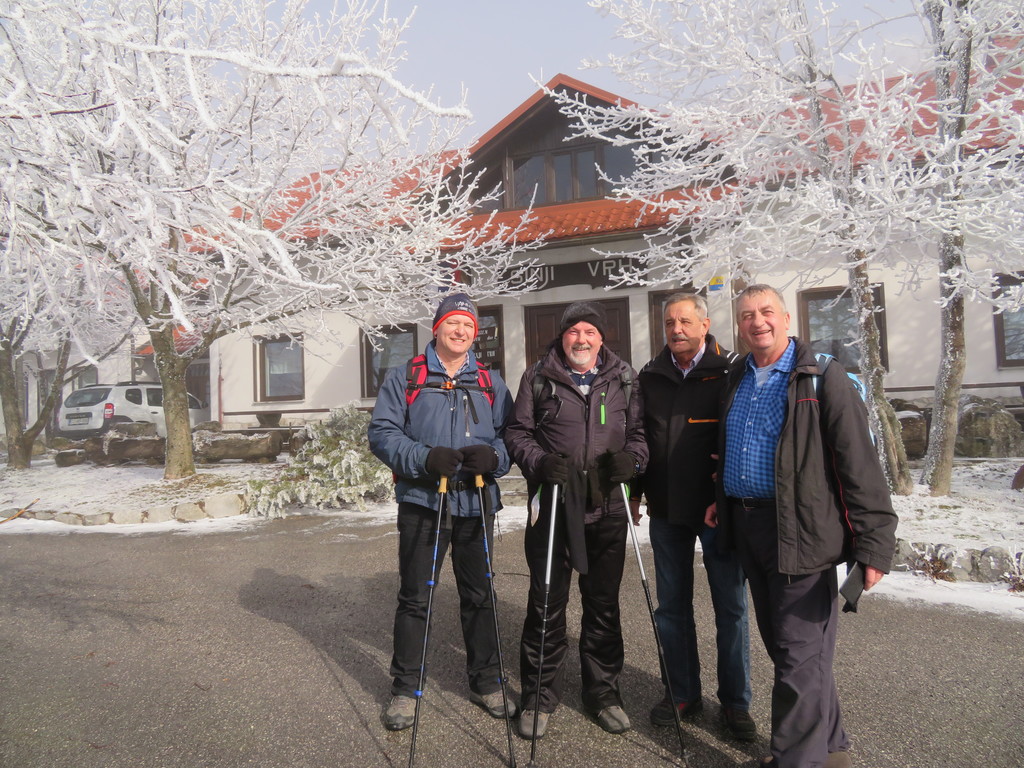 Skupina se je povzpela najprej na sam vrh tisočaka, kjer je sledila fotografija, nato pa spust v domačijo na okrepčilo in počitek. Prijazni gostitelji so nam postregli s toplo pijačo in tudi prigrizkom. Pohodnike, je ob ognjišču pozdravil župan Zvone in pohvalil udeležbo, ki so jo sestavljali pohodniki po starosti v razponu 70 let. Zahvalil se je tudi sponzorjema Milanu in Marku za njihov prispevek k dobremu druženju.