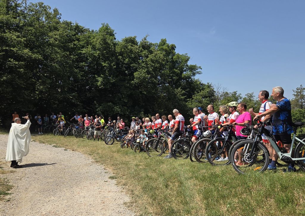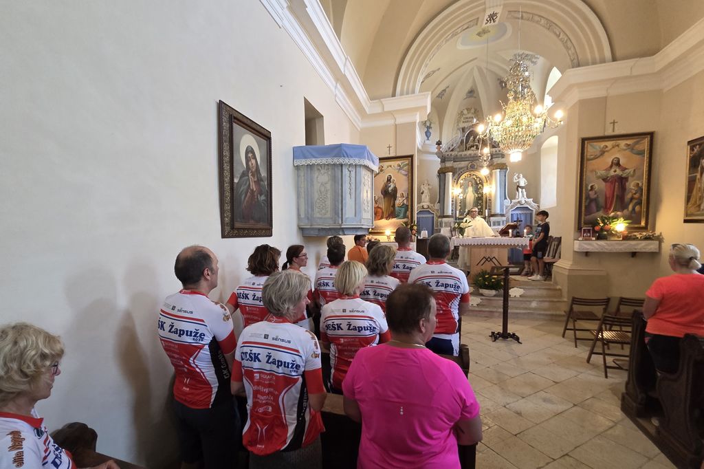 Pri Maši ja g. Furlan pozdravil vse romarje, ki so prišli k maši, še posebej pa kolesarje, ki jih je priporočil Mariji v varstvo na vseh poteh s kolesom. Mnogo je trenutkov pri vožnji, ko se lahko zgodijo nesreče, za katere ne moremo storiti ničesar in so odvisne od drugih okoliščin. Za take situacije se obračamo k Mariji, da nam pomaga. S priprošnjo za varstvo, se nas je skupina dvajsetih članov, po obredu, spustila v dolino ob blagem vetriču, ki je hladil potna čela.