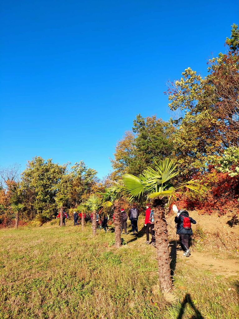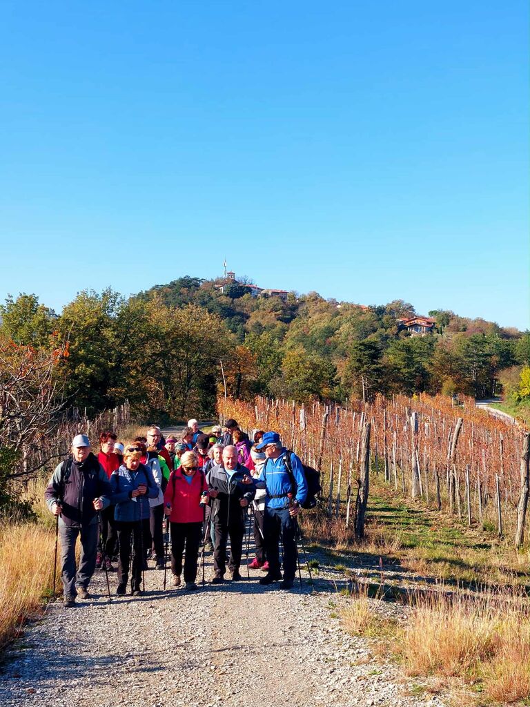 Danes praznuje svetnik Martin, prav ta, ki sladki mošt spreminja v vino. In njemu v čast smo naš pohod usmerili proti cerkvici sv. Martina nad Brjami. Veter je tu malo potihnil in po lepi makadamski poti smo se podali proti cilju. Položna pot nas je peljala skozi gmajne, med vinogradi, ki se v svojih zlatih, jesenskih barvah odpravljajo k počitku, ter med mladimi oljčniki, ki obetajo dobro vipavsko oljčno olje. Ker obljuba dela dolg, smo se čisto zares sprehodili tudi po palmovem drevoredu.