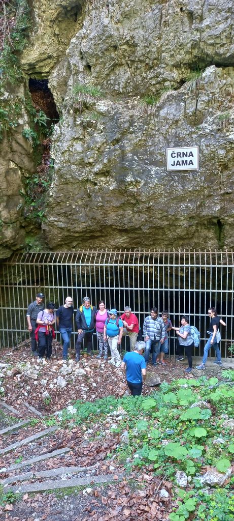 Tudi divje češnje so bile v polnem razcvetu, kar je privabljajo čebele, ki so imele v bližini kar nekaj urejenih domovanj – čebelnjakov. Ob klepetu in občudovanju vseh lepot narave smo prispeli do Črne jame, ki se nahaja sredi gozdnate kraške planote in je eden od vhodov v jamski sistem predjamske Pivke. Možen je turistični obisk z vodičem, vendar mi smo šli le do vhoda v jamo, ki se odpira na dnu velike udorne vrtače. Skozi jamo je speljan predor, po katerem je leta 1944 prišla skupina partizanov in v vhodnih delih Postojnske jame zažgala nemško vojaško skladišče bencina ter se srečno vrnila na površje. Zgodba je omenjena tudi v vsem dobro znanem filmu 'Ne joči Peter'. Letos torej mineva 80 let od tega dogodka.