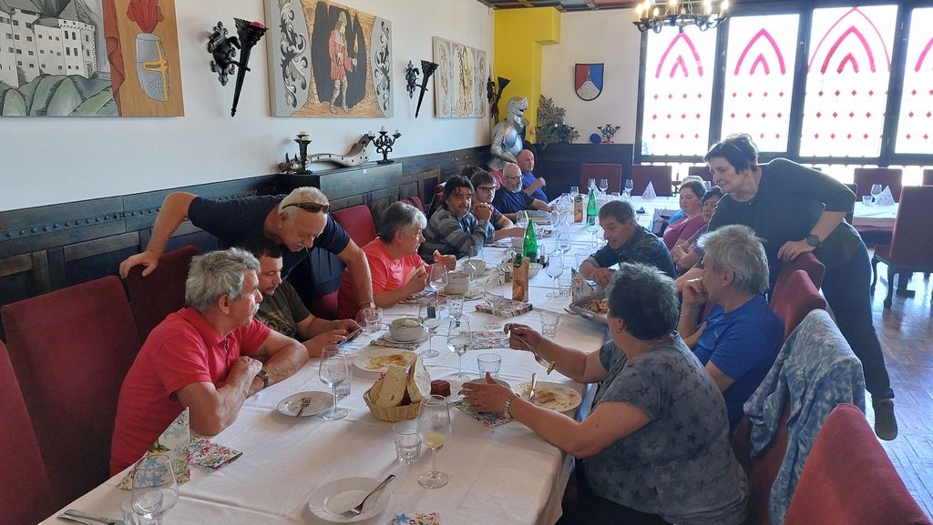 Po povratku nazaj k našim jeklenim konjičkom smo se odpeljali do restavracije Erasmus, poimenovane po epskem, velikem vitezu Predjamskem, kjer nas je prijazni natakar v razkošni viteški dvorani postregel z nedeljskim kosilom.