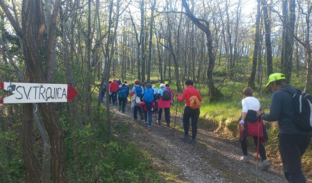 Pot nas je vodila po lepi makadamski poti po Rebru mimo 'špine', pri kateri smo se lahko odžejali, in dalje do križa ob vinogradu. Tega so vinogradniki postavili Bogu v čast in zahvalo ob 10. obletnici pohodov v Reber in stoji na stičišču dveh pobočij, Rebra in Pasjega repa. Na prijetnem soncu je sledil krajši postanek za pijačo, nato pa smo kratek čas hodili ob vinogradih, krajši strmi stezici in spet po poti, ki nas je pripeljala na sv. Trojico. Na klopeh pred cerkvico smo si privoščili okrepitev, naš pohodnik Igor pa nas je ob nedavnem rojstnem dnevu pogostil z odlično domačo čokolado in jagrom. Vse najboljše, Igor.