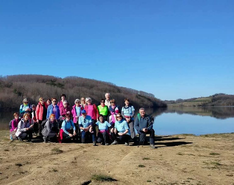 Lepa makadamska pot nas je med oljčniki, vinogradi in skozi podvoz avtoceste pripeljala do Vogrščka. Bili so tudi občasni umiki s poti, da nas niso mimoidoči kamion, traktor in avto preveč oprašili. Ob Vogrščku, kjer je bila večina pohodnikov prvič, smo si privoščili počitek za malico in spominsko fotografijo. V prijetno toplem pomladnem dopoldnevu je bil res to enkraten postanek. Ena od pohodnic se je pošalila, zakaj v vabilu ni pisalo, da prinesemo kopalke s seboj … Ja, glede na prijetne temperature je bilo vreme res skoraj primerno kopanju.
