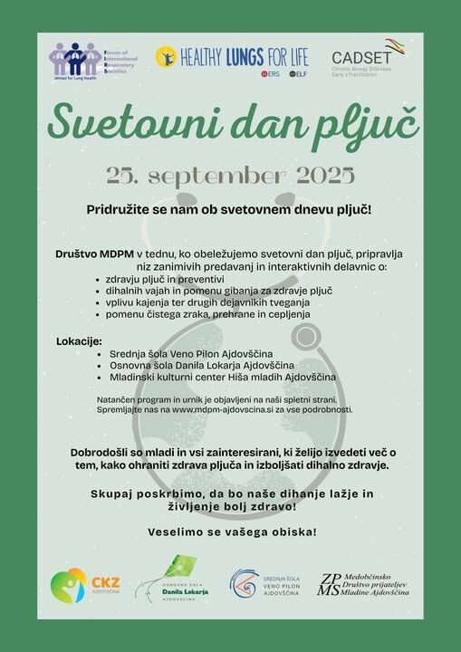 Društvo MDPM Ajdovščina v tednu, ko obeležujemo svetovni dan pljuč, pripravlja vrsto zanimivih predavanj in interaktivnih delavnic na temo zdravja in skrbi za naša pljuča.