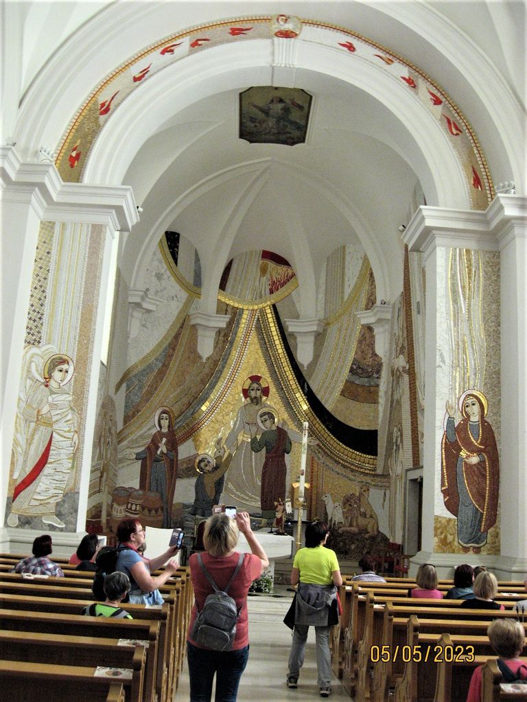 Po skupinski fotografiji se je 38 pohodnikov usmerilo po protipožarni poseki, ki je ravno dovolj strma, da so zventilirali pljučne mešičke in se dvignili kar visoko na Vrhpolje, kar je bilo čutiti ob spustu proti vasi. V cerkvi sv. Primoža in Felicijana smo si ogledali mozaike patra Rupnika, ki jih je podrobno predstavila Zdenka Žigon. Pri upodobitvi Jezusovega čudeža v Kani Galilejski si je Rupnik privoščil precej 'umetniške svobode' in namesto vrča upodobil nafo, to svojevrstno vrhpoljsko posebnost (Vrhpoljci = nafarji), kakor tudi pri hramu s sedmimi sodi, kjer je šesti kar nekako v zraku. Rupnikova ekipa je za postavitev mozaika, ki zapolnjuje cel prezbiteriji in še slavoločno steno, potrebovala vsega en teden. Nov je tudi križev pot, ki je bolj skladen z mozaiki.