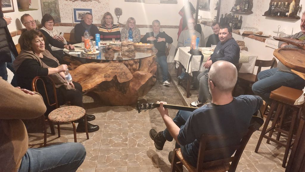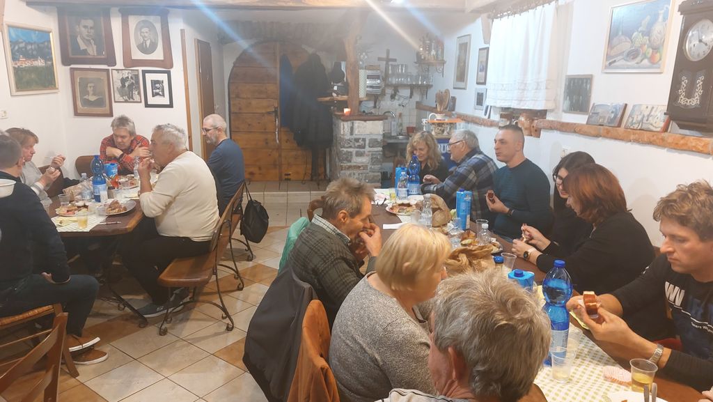 In nadaljevanje! Rekli bi lahko, da so se mizam pod dobrotami šibile noge, toliko jih je bilo. Pred 'uporabo' pa jih je požegnal pater. Če bi se tak dogodek zgodil pred pričetkom abstinence, bi rekli, da nam je rujna kapljica razvezala jezike, pogovori so kar stekli, po potrebi tudi z menjavami sedežnih redov. Damjan je uglasil kitaro na Iztoka Mlakarja, da smo še zapeli. Škoda, ker je bil ponedeljek in so se nekateri spomnili, da je v torek služba, sicer bi še nadaljevali. Obljubili smo si, da se pred novim letom še nekajkrat zberemo v taki zasedbi, saj smo le veseli ljudje lahko srečni ljudje.