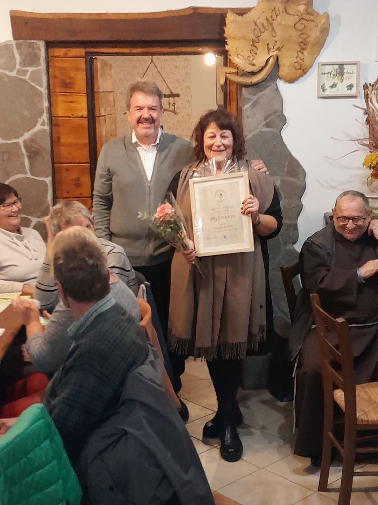 Po maši smo kot običajno druženje nadaljevali 'pri Milojki'. Milojka je žena našega člana, več let ga je tudi spremljala na terapevtskih srečanjih v društvu. Oba nas ob vsaki taki priložnosti gostoljubno sprejmeta v svoje prostore, zato je društveno priznanje, ki ga je Milojki predal naš predsednik Ivan, več kot zasluženo.