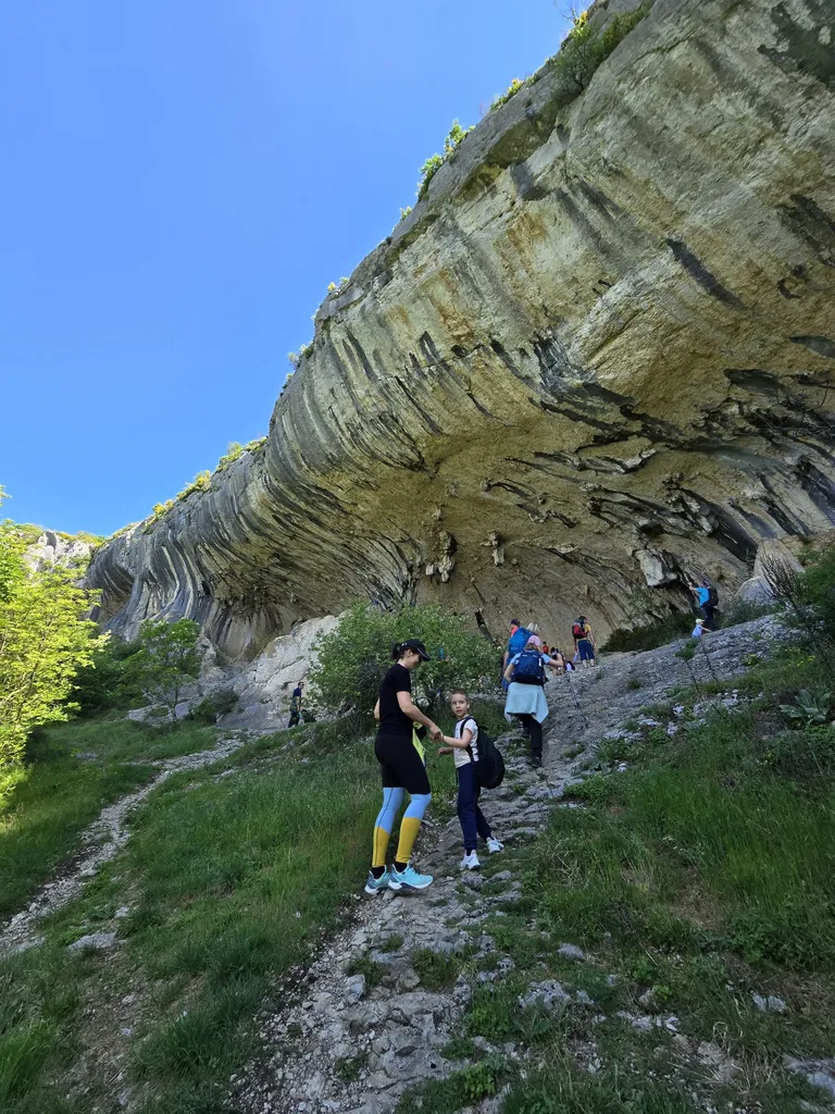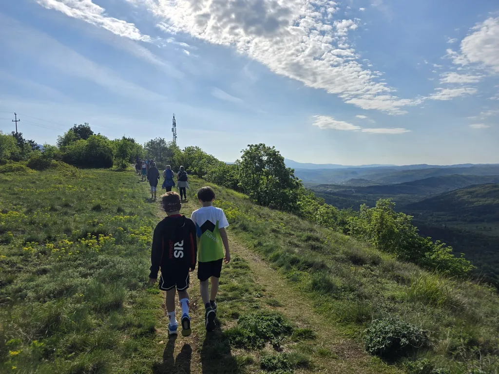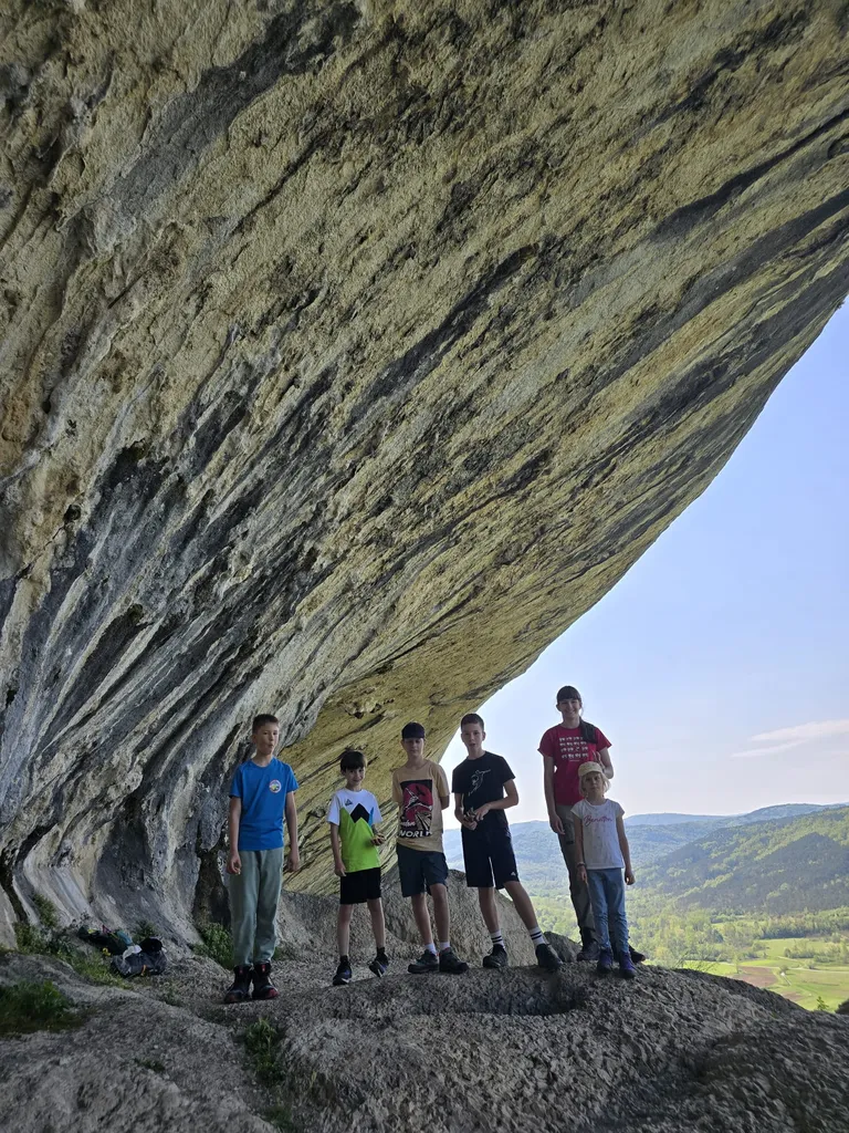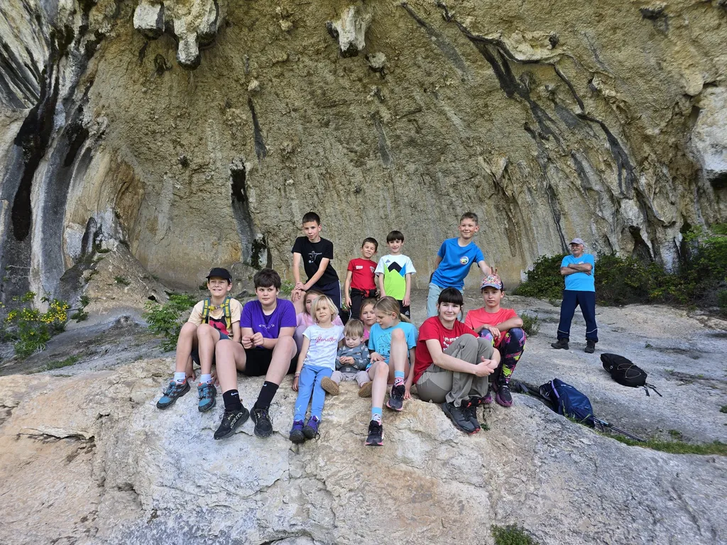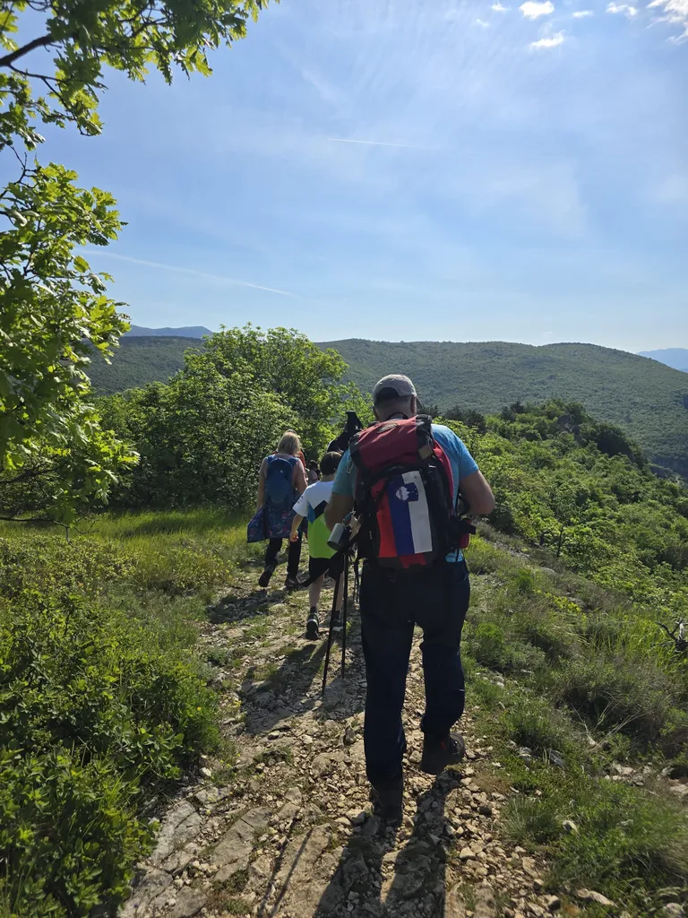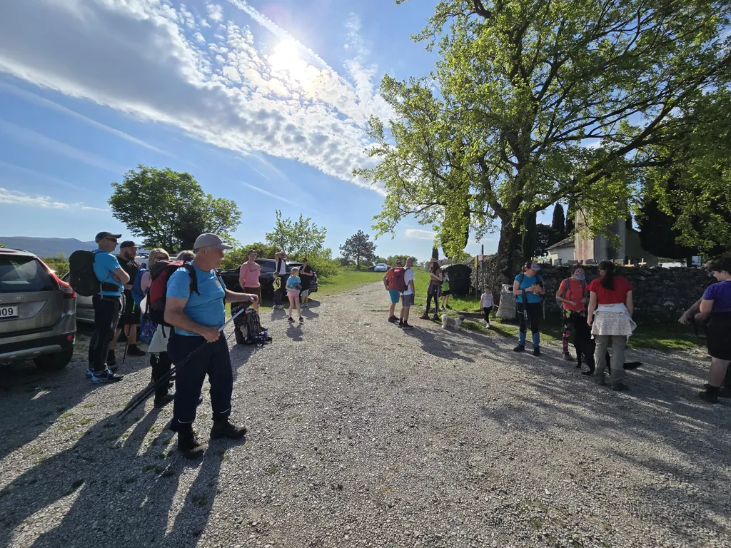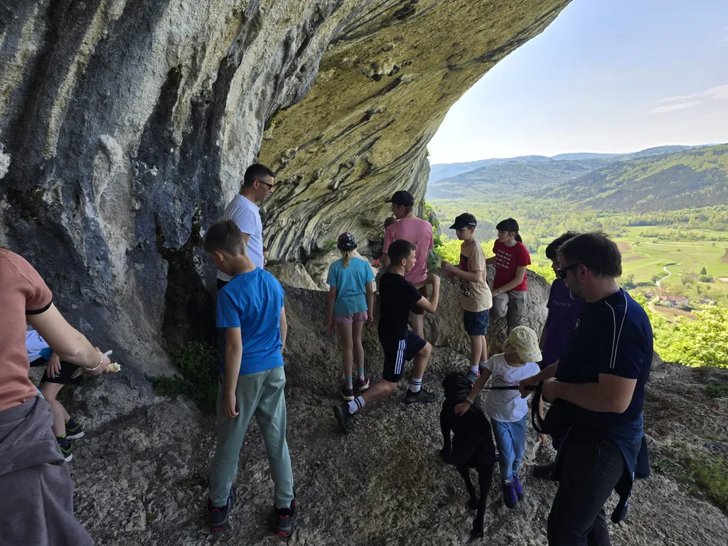 Napovedana sončna sobota, 18. 4. 2026, je kar klicala po novem planinskem izletu OŠ Danila Lokarja Ajdovščina v sodelovanju s PD Ajdovščina. Število udeležencev se iz izleta v izlet povečuje, kar verjetno pomeni, da vodniki za zdaj uspešno izbiramo zanimive ture, ki iz domačega udobja privabijo tako učence kot tudi njihove starše. Tokrat se nas je zbralo 31. Naš cilj je bil Kraški rob, natančneje naravna znamenitost Veli Badin, znana tudi kot 'ušesa Istre'.