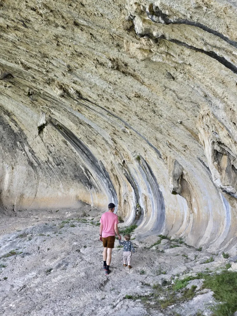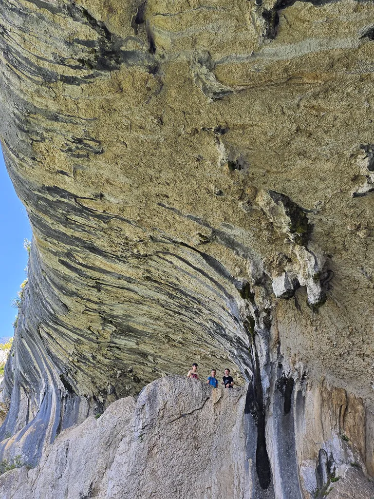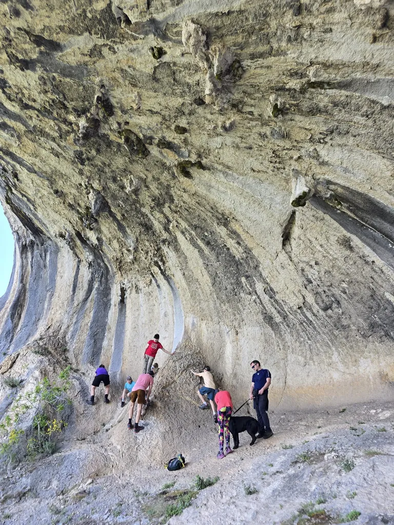 Počitek v prijetni senci spodmolov je bil še kako dobrodošel, saj je 'sestop' proti izhodišču pomenil pravzaprav nekaj sto višinskih metrov vzpona. Da, prav ste prebrali – cilj je bil nižje kot izhodišče. Takoj ko smo zapustili senco, nam sonce ni prizanašalo. Ob vsakem postanku smo zadihani in žejni iskali vsaj nekaj zavetja pod redkimi drevesci, ki so nudili nekaj sence in hladu.