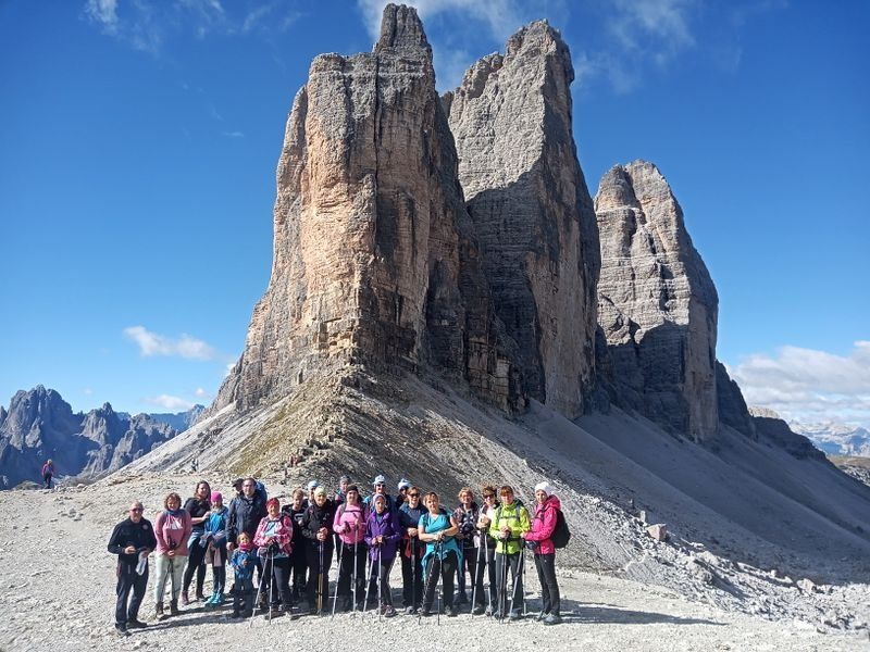 Septembrska nedelja je prinesla enega najuspešnejših pohodov v zgodovini društva. Kar dva avtobusa ljubiteljev gora sta se podala v prekrasen gorski raj v okolici Treh Cin (Tre Cime) v Dolomitih. Razdelili smo se v pet skupin pod vodstvom 9 vodnikov društva in treh pomočnikov. Za dodatno varnost sta bila z nami gorska reševalca. Tri skupine so zaokrožile po znameniti poti okoli Treh Cin, dve pa sta prečili zahtevni Monte Paterno.