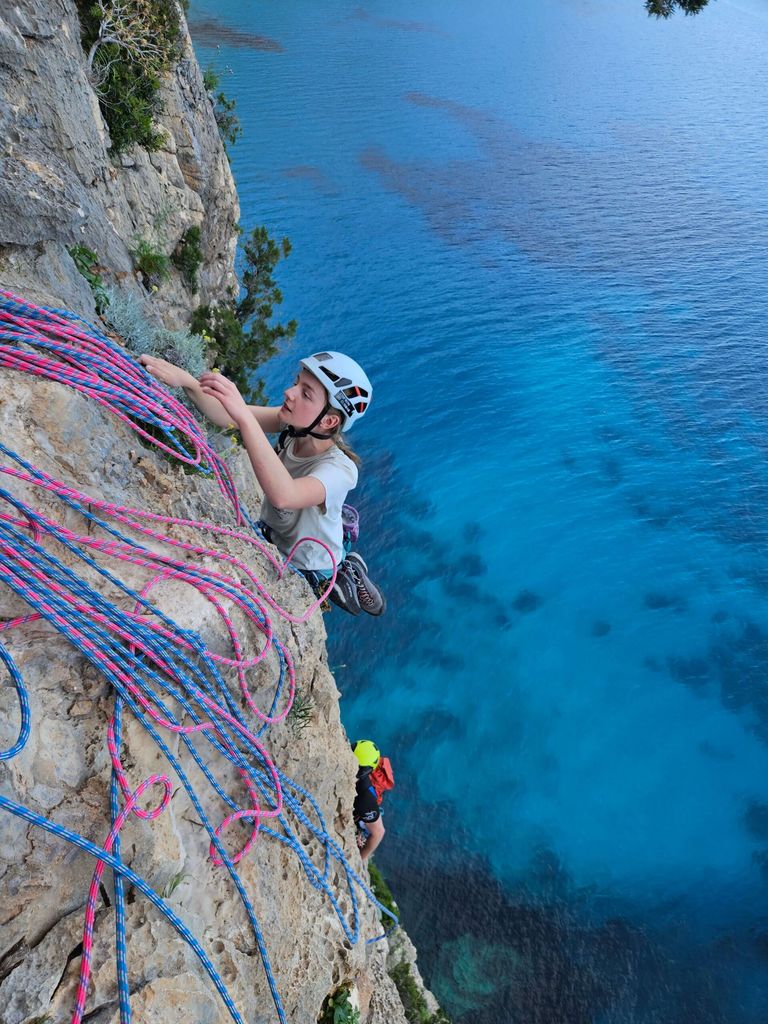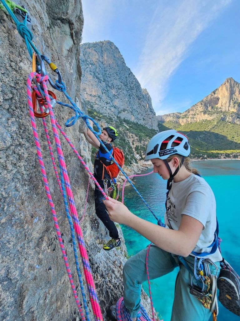 Sardinijsko morje je postreglo z vetrom, valovi in nevihto, a z dobro energijo in trdno ekipo smo brez večjih težav premagali vse izzive. Vmes smo osvajali tudi bolj turistično znane točke, kot je Cala Goloritze – letos izbrana za najlepšo plažo na svetu. Jutra so se začela s kavo na barki, sledila je kratka vožnja z gumenjakom do obale, nato pa nekaj ur plezanja na strmih, sončnih stenah tik nad turkiznim morjem. Popoldnevi so bili rezervirani za kopanje, sprostitev in premike do nove lokacije, večeri pa za druženje, kuhanje in smeh pod zvezdami.