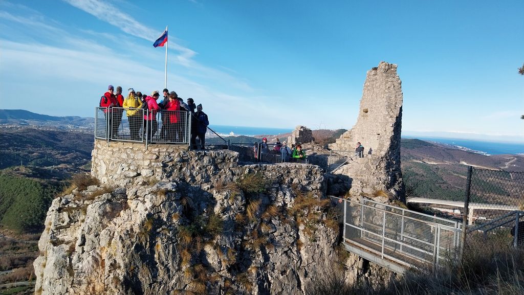 Najprej smo se na kratko ustavili na razgledni točki Črni Kal nad Gabrovico, kjer smo lahko občudovali pokrajino od Trsta do doline Rižane, Kopra in Istre in seveda avtocestni viadukt in viadukt Drugega tira kar globoko pod nami. Avtobus smo zapustili pod Črnim Kalom in se povzpeli na Črnokalsko utrdbo, kjer so bili pogledi seveda še lepši. Trdnjava se nahaja na 30 metrov visoki skali, do katere vodi mostiček preko globokega brezna. Utrdba je bila nekoč počivališče trgovcev in potnikov, danes pa je lepo urejena kot pomemben zgodovinski spomenik. Pot smo nadaljevali po gozdičku, nato preko železniške proge in po Kraškem robu do oddajnika. Spet smo občudovali prelepo pokrajino pod sabo. Po gozdni poti smo šli naprej do majhne cerkvice sv. Marije Snežne na Gradišcah, kjer smo imeli malico iz nahrbtnikov. Franko je s svojimi salami poskrbel še za dopolnitev te malice, pa tudi nekaj pijače se je našlo. Nadaljevali smo po travnatih kolovozih mimo vasi Černotiči navzdol do Črnega Kala, kjer nas je čakal avtobus. Zapeljali smo se do Centra za obiskovalce Kraški rob. Ogledali smo si prezentacijo o gradnji tega zahtevnega projekta. Znameniti Drugi tir poteka od Divače do Kopra v dolžini 27 km in kar 75 odstotokov pod zemljo, v sedmih predorih in preko treh viaduktov. Zadovoljni in dobre volje smo si privoščili še popoldansko malico v gostilni Križman v Tubljah pri Hrpeljah.