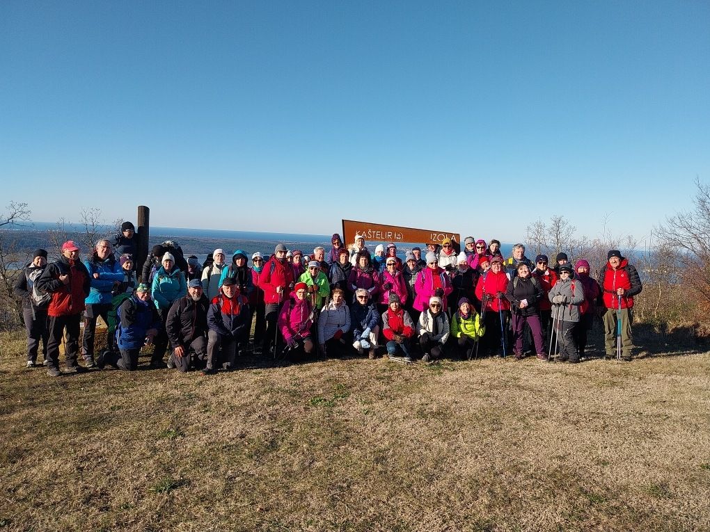 Avtobus smo parkirali v Kortah, ki je največja vas tega področja. Kar 54 se nas je zbralo. Pot je pomagala izbrati in nas po njej vodila Helena Košir, doma iz Kort. Cel teden smo zaskrbljeno pogledovali vremensko napoved. Burja in celo sneg nista dajala ravno nekega zagotovila, čeprav je za soboto kazalo na sonce. Zjutraj pa smo se zbudili v zimski dan brez oblačka in celo veter je skoraj ponehal. Naša prva postaja je bilo veliko gradišče Kaštelir nad Kortami. Pred kratkim urejeno več kot 5.000 let (!) staro naselje, ki je imelo takrat celo tisoč prebivalcev, ni tako, kot bi moralo biti. Res škoda, da Slovenija ne zna izkoristiti in urediti svojih biserov. Prelepi razgledi na zasnežene Alpe, Krn, Triglav in Dolomite ter morje v čistem zraku brez oblačka.