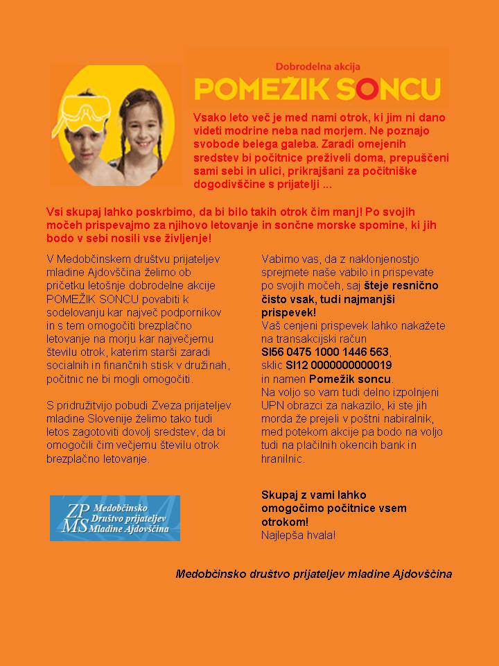 V Medobčinskem društvu prijateljev mladine Ajdovščina želimo ob letošnji dobrodelni akciji POMEŽIK SONCU povabiti k sodelovanju kar največ podpornikov in s tem omogočiti brezplačno letovanje na morju kar največjemu številu otrok, katerim starši zaradi socialnih in finančnih stisk v družinah, počitnic ne bi mogli omogočiti.