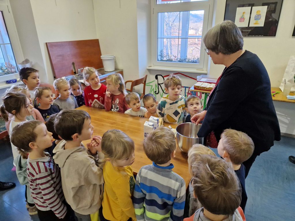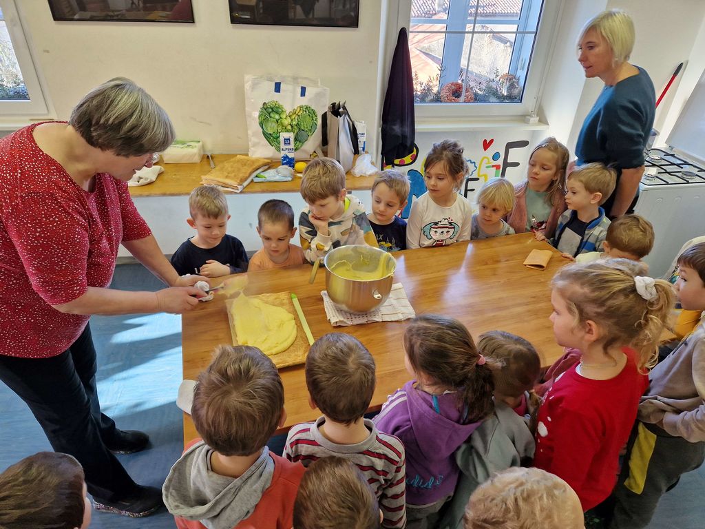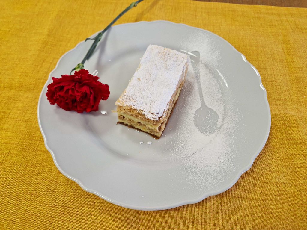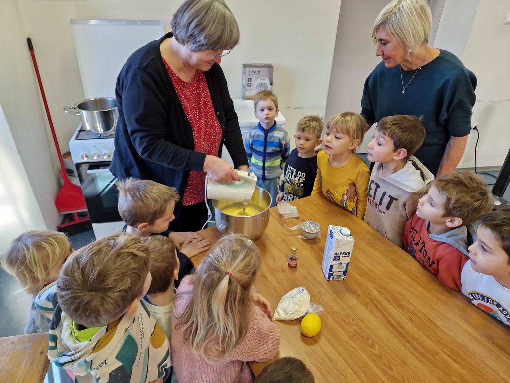 Njena posebnost je, da je sestavljena iz treh plasti testa in kreme. Listnato testo je gospa že pred tem spekla, z otroki pa smo skuhali odlično kremo. Otroci so z velikim zanimanjem spremljali potek dela in si dobro zapomnili vse potrebne sestavine.