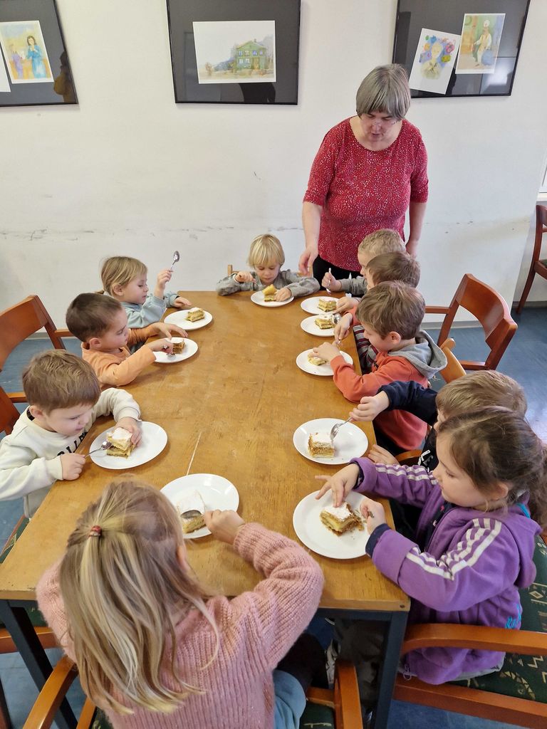 Ko je bila krema kuhana, smo v pekaču sestavili našo domačo dobroto. Tako pripravljena se mora potem še nekaj časa ohlajati (najbolje kar v hladilniku čez noč). Z otroki smo ta čas zapolnili z igranjem prstnih iger in petjem otroških pesmi. Ob zaključku nam je ga. Anita pripravila presenečenje in nas postregla že z ohlajeno paštakremo, ki jo je posebej za nas pripravila že dan prej. Delavnico smo tako obogatili s sladko pogostitvijo in novim receptom iz kuhinje vipavskih gospodinj.