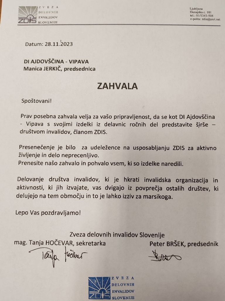 Ponosni smo na zahvalo, ki smo jo prejeli od Zveze delovnih invalidov Slovenije!
