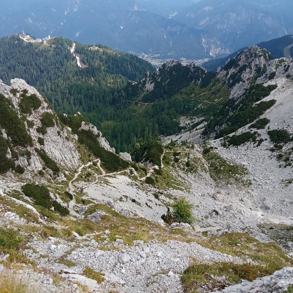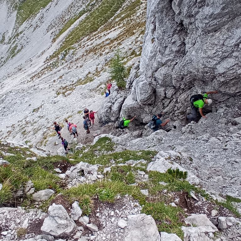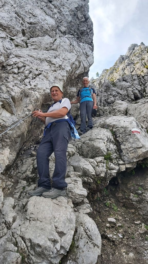 Ko smo že pošteno grizli kolena, se nam je v soncu nasmehnila planina s pašno živino. O, duh po pravih planinah! In potem vzpon, ki potegne iz človeka zadnjo kapljo znoja. Vendar … pri kapelici smo se zbrali. Pred nami Svete Višarje, na levi Kamniti lovec, poslastica pravih vzponov, od daleč nas je pozdravljal Mangart, ki je imel megleno kapo, v ozadju Jalovec, na drugi strani pa italijanske planine in Alpe, še s sneženimi vrhovi. Tudi tu smo se po interesih delili v skupine in nadaljevali svojo pot: kamniti lovec, maša na Svetih Višarjah, ogled idilične vasice in …