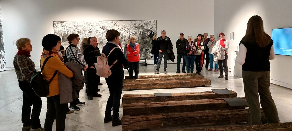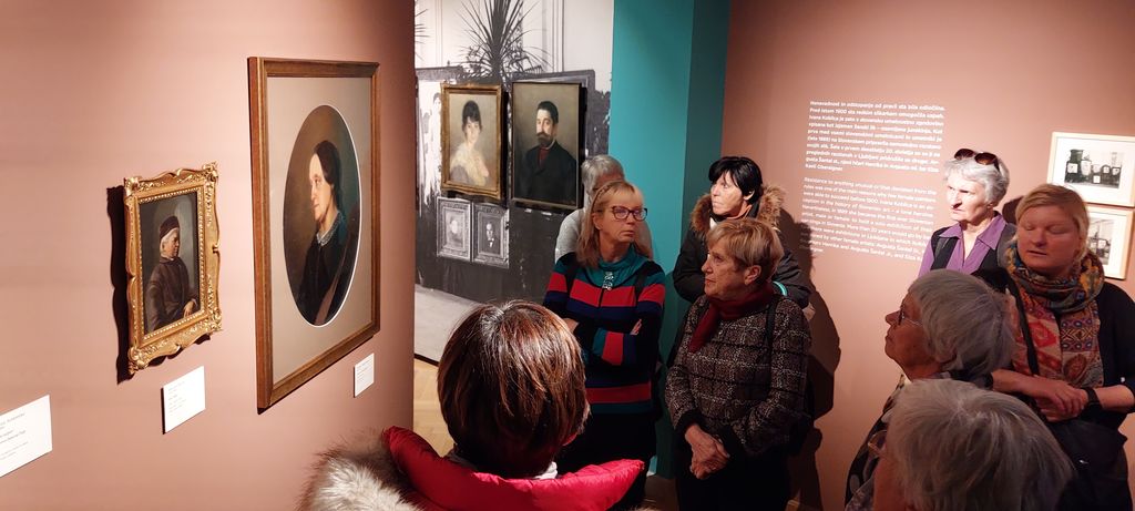 Manj znane podrobnosti o znamenitostih od Cukrarne ob Ljubljanici navzgor (s poudarkom na Plečnikovih delih) pa nam je odkrivala Tina Ponebšek, sicer direktorica Pilonove galerije, ki je svoje poznavanje likovne umetnosti dokazala z imenitnim vodenjem po razstavi v Mestnem muzeju (ki domuje v še eni posodobljeni zgodovinski zgradbi – Turjaškem dvorcu). 'Slovenske umetnice v obdobju 1850–1950' je naslov razstave, ki v središče postavlja 22 slikark in kipark in njihovih 100 njihovih umetniških del. Ustvarjale so v časih, ki ženskim umetnicam nasploh niso bili naklonjeni (tudi če so bile finančno preskrbljene), posebej pri strokovnem izobraževanju, saj so imele akademije še dolgo v 20. stoletje zanje zaprta vrata. Pa tudi kasneje so, deklarativno emancipirane, morale tehtati med žensko družinsko vlogo ali umetniško svobodo ...