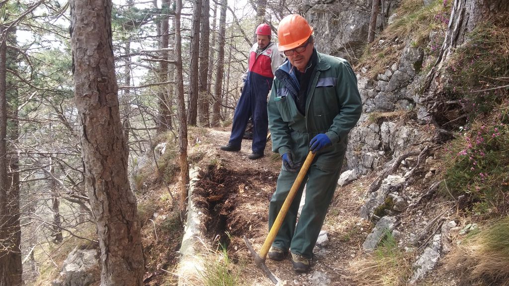 Požrtvovalno, s kosami, krampi in barvo stopajo po pobočju Čavna in nam pripravljajo lepe in varne poti.