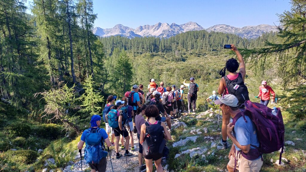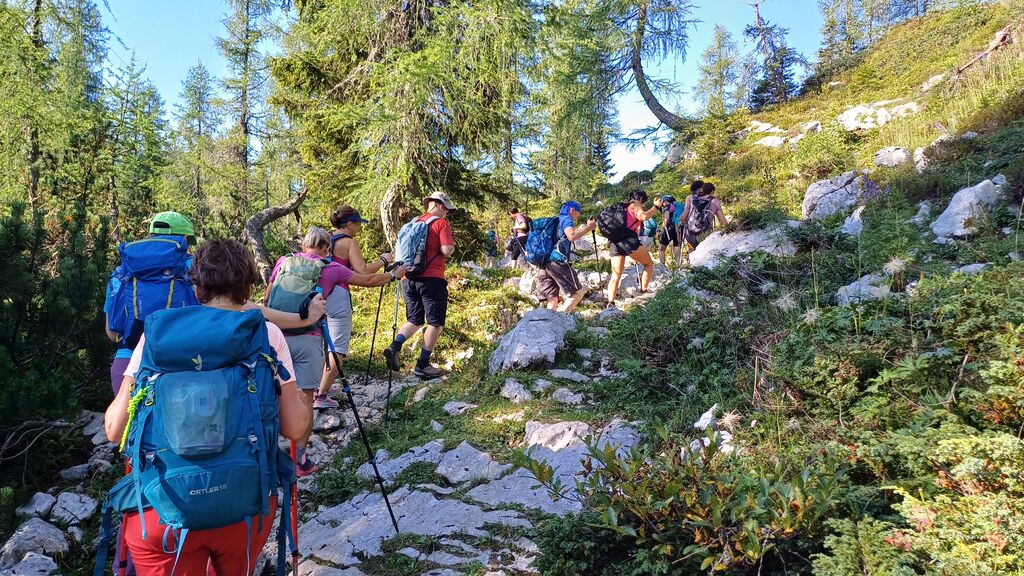 Posamezni macesni so omejevali našo stezo, spremljali so nas skalnati očaki na severni strani, topleje so nam mežikale Južne bohinjske gore z Bogatinom v ozadju. Od časa do časa so zadišale ciklame, pogled se je ustavljal na planikah, ki so se upirale sončni pripeki. Naša pot se je dvigala navzgor in se spuščala navzdol. Vztrajno smo jo premagovali. Sonce je tekmovalo z nami, vendar se nismo predali. Vsak kamen, ki smo ga srečali na poti, vsako drevo, ki smo mu namenili pogled, je bilo lepota, občudovanja vredna.