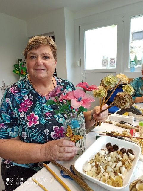 Tokrat se je Jožica udeležila tedenske delavnice invalidov Slovenije z naslovom: 'Izdelovanje cvetja iz različnih materialov' v Radencih. Delavnico je svojim članom omogočila Zveza delovnih invalidov Slovenije. Vsaka delavnica ima strokovnega vodjo in tako so vrhunski izdelki zagotovljeni. V tokratni delavnici so izdelovali lesene cvetove, rože iz najlon nogavic in šopek rož iz krep papirja. Že sama slika pove o zadovoljstvu nad izdelanimi izdelki.