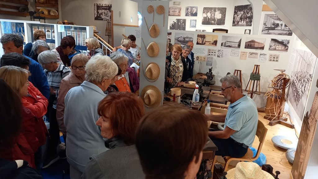 Čudovit, še poletni oktobrski četrtek, je bil kot nalašč za potepanje krožka Zgodovinska potepanja po Domžalah in Kamniku. Današnje Domžale so pravzaprav nastale leta 1925 z združitvijo več vasi, leta 1952 pa so postale mesto. S hitro razvijajočo se obrtjo in industrijo so rastla tudi nova stanovanjska naselja in soseske. Območje okrog Domžal je že več stoletij znano po slamnikarstvu, saj je v cerkvi sv. Mohorja in Fortunata freskant Franc Jelovšek že leta 1761 upodobil snop žita, srp in slamnik. V drugi polovici 19. stoletja in v začetku 20. stoletja je tu delovalo kar 25 slamnikarskih delavnic in tovarn, ki so zaposlovali okrog 1000 delavk in delavcev, letno pa so izdelali do milijon slamnikov. Tradicija slamnikarstva je prikazana v Slamnikarskem muzeju, ki domuje v Godbenem domu. Gospod Roman nas je popeljal po razstavljenih predmetih in nam tudi v živo prikazal, kako se iz slame plete take in drugačne kite, kako se jih na prav posebnih šivalnih strojih šiva skupaj in seveda, kako nastane slamnik. Potem nas je popeljal še po starem delu kraja, ustavili smo se v Menačenkovi domačiji, saj je obnovljena domačija tipičen primer arhitekture s konca 19. stoletja na tem območju. Po poti mimo župnijske cerkve Marijinega vnebovzetja, Kulturnega doma in Slamnikarskega muzeja smo spoznavali značilnosti in zgodovino kraja in tudi kar nekaj Plečnikovih mojstrovin.