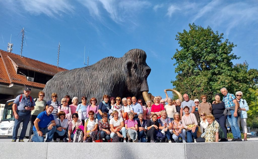 Na avtobusni postaji smo se fotografirali še ob bronastem kipu mamuta, ki so ga postavili marca letos. Med obema vojnama so namreč v bližini, ob gradnji mostu čez Nevljico, odkopali eno najbolje ohranjenih okostij mamuta, ki je sedaj v Prirodoslovnem muzeju v Ljubljani.