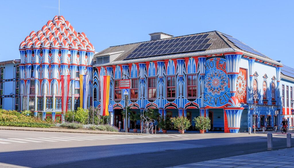 Čeprav smo se prometnim zagatam na slovenskih cestah skušali izogniti z zgodnejšim odhodom iz Ajdovščine, pa smo že do karavanškega predora pridelali skoraj uro zamude. Nadoknadili bi jo lahko s hitro kavico na barvitem trgu nekdanjega sedeža koroških vojvod v Šentvidu na Glini, a kaj ko delovni Avstrijci na četrtek dopoldan ne posedajo po kavarnah - od šestih je bila odprta le ena! Toda bolj kot romansko-gotska cerkev sv. Vida, ki je kraju dala ime (posvečena sicer tudi sveti Trojici), z okrasjem nasičena fasada mestne hiše in druge palače je sprožilce fotoaparatov (mobitelov) privabljal res nenavadno barvit hotel izven grajskega obzidja.
