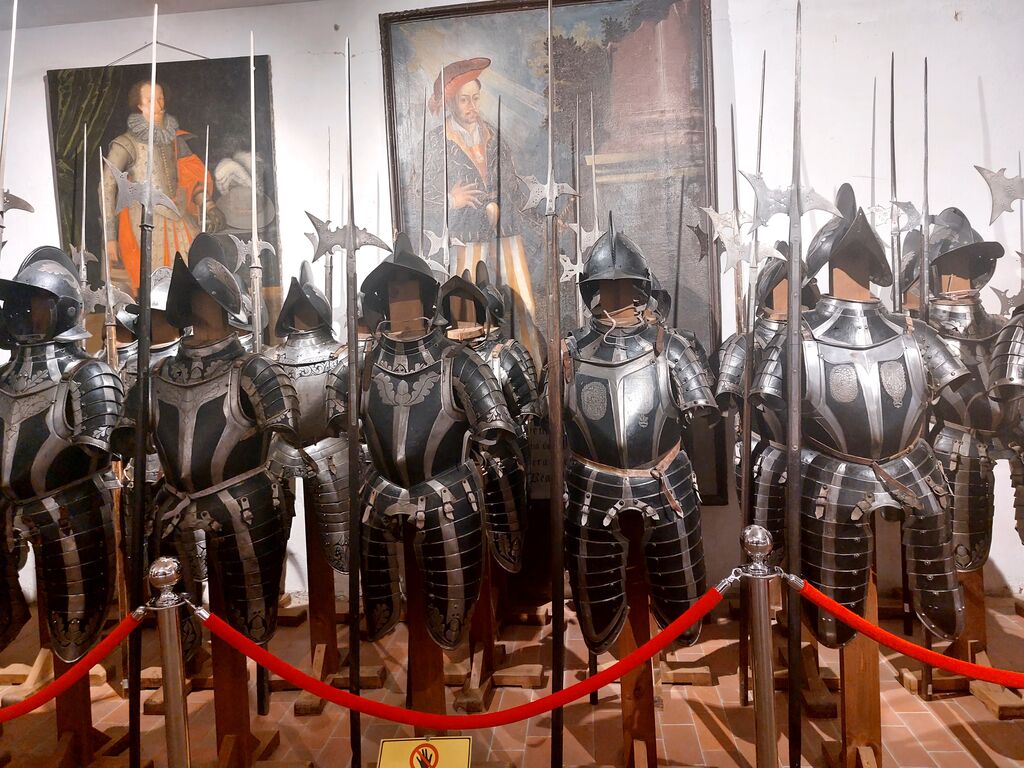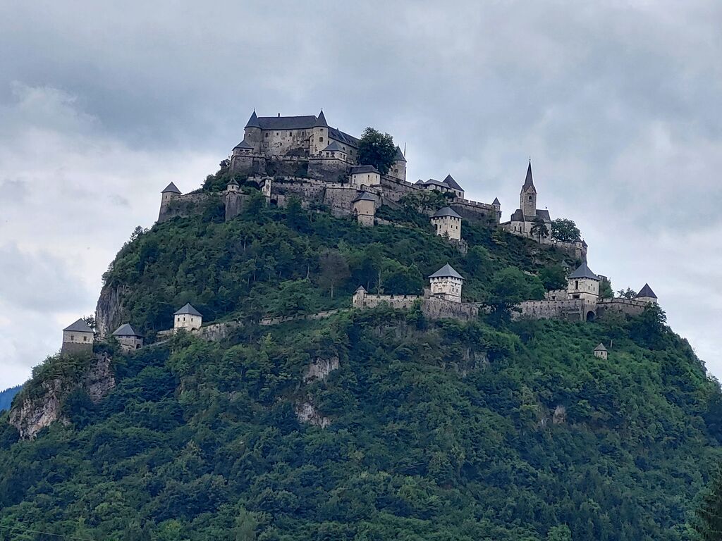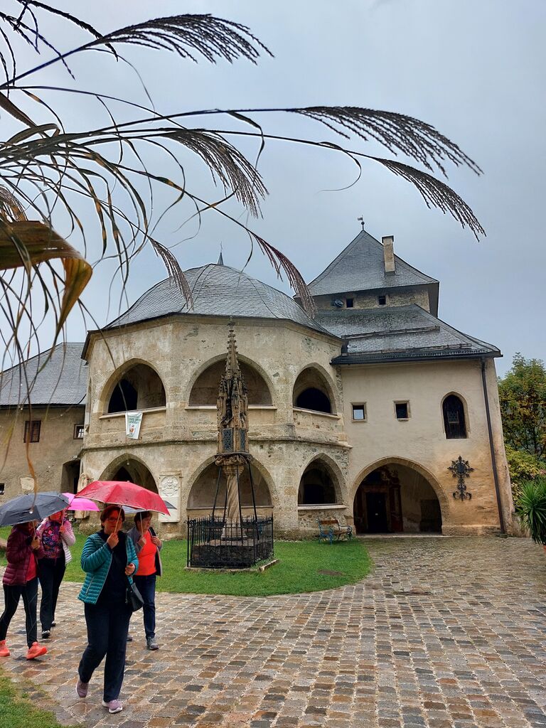 Po kratki vožnji smo že od daleč uzrli grad na približno 150 metrov visokem skalnem osamelcu. Grad Ostrovica sodi med najbolj slikovite gradove v Avstriji. Do njega vodi 700 metrov dolga pot s kar 14 vrati zapored, ki so na različne načine onemogočale napadalce. Domiselna obramba je bila učinkovita, saj gradu niso nikoli zavzeli, niti Turki ne. Zato se je v gradu nabralo (ali pa ostalo) ogromno orožja, lepo razporejenega v muzeju v enem od grajskih kril. Pripadniki grajske straže v popolni opravi delujejo kot palčki v primerjavi s kar 225 cm visokim poveljnikom. Zbirko dopolnjujejo portreti kronanih glav, ki jih je dinastija Khevenhüller, še danes lastnica gradu, v skoraj petih stoletjih gostila. Čeprav vozi na vrh poševno dvigalo, pa se nihče od 52 udeležencev ni odločil za tovrstno adrenalinsko izkušnjo in so raje zaupali svojim nogam in bili nagrajeni z lepimi razgledi in imenitnimi motivi (cerkev, grajski vrt).