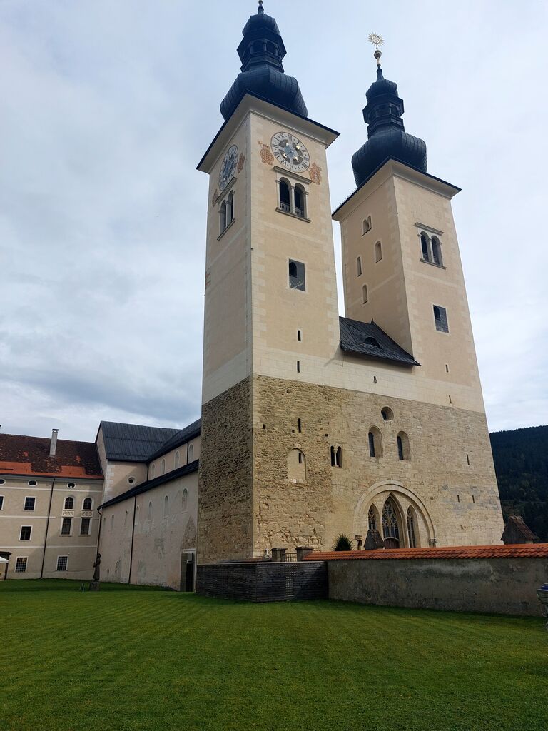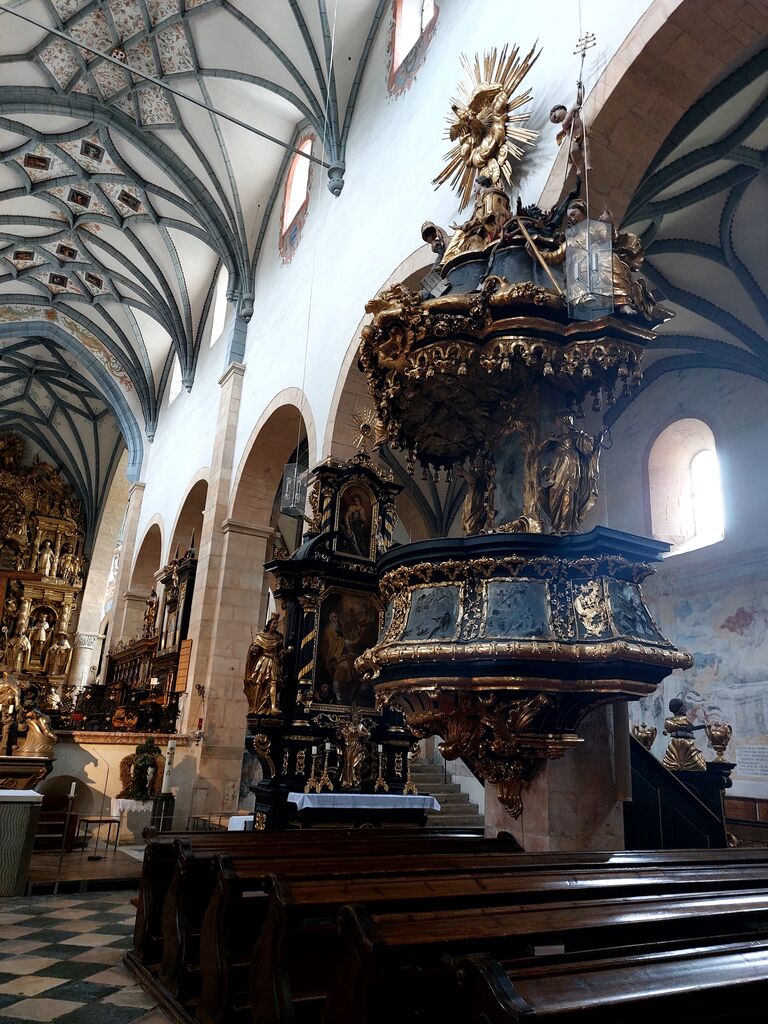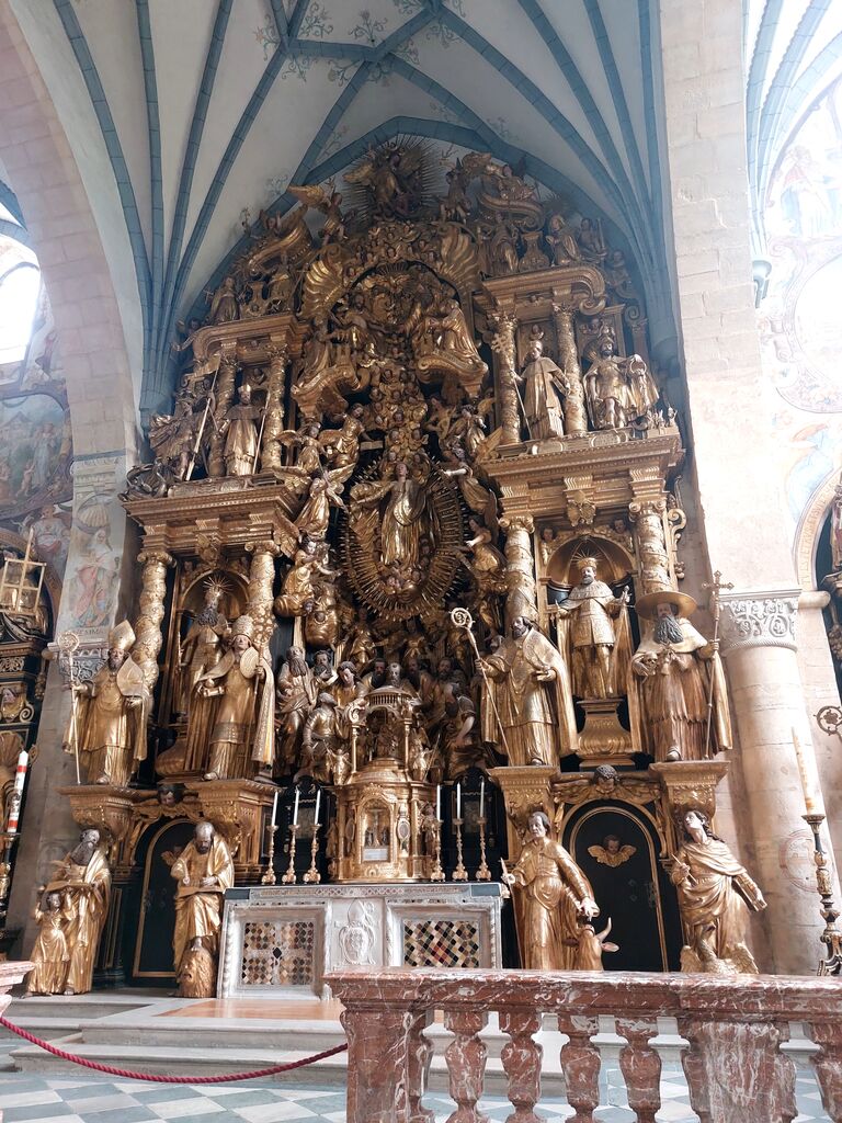 Cerkev (s statusom konkatedrale) je danes prepolna dragocenosti neprecenljive vrednosti in kar nismo se mogli načuditi bleščavi velikanskega baročnega oltarja iz 17. stoletja, prižnice, umetelno izrezljane cerkvene opreme, fresk in reliefov, ki upodabljajo dogodke iz življenja grofice Eme. Predstavlja tudi učno uro stilov, ki so se v skoraj tisoč letih zvrstili – od romanske triladijske zasnove, gotskih portalov in vitražev, rebrasto obokanih stropov s sklepniki, poznogotskega triptiha na stranskem oltarju, kipov in druge opreme po renesančnem zgledu … in seveda do prevladujočega baroka.