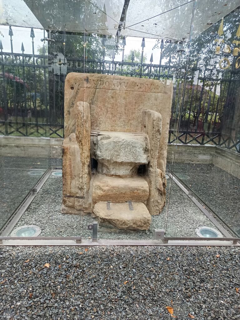 Zapustili smo Krko in se končno zaustavili na Gosposvetskem polju, kjer je sijoče zlate oltarje zamenjala kamnita skromnost vojvodskega prestola, resda dvojnega. Nič grofovsko se najbrž nista počutila na golem kamnu novoizvoljeni vojvoda in kraljevi odposlanec, prvi na kapitlju narobe obrnjenega rimskega stebra, drugi na grobem kamnu, s skalno ploščo kot skupnim naslonjalom, vse skupaj pa pripeljano in zloženo iz ostalin Viruna, nekdanje prestolnice rimske pokrajine Norik. Ne samo ograjen s kovinsko ograjo, tudi v stekleni kletki zdaj prestol pričakuje obiskovalce, praviloma s sončne strani Karavank.