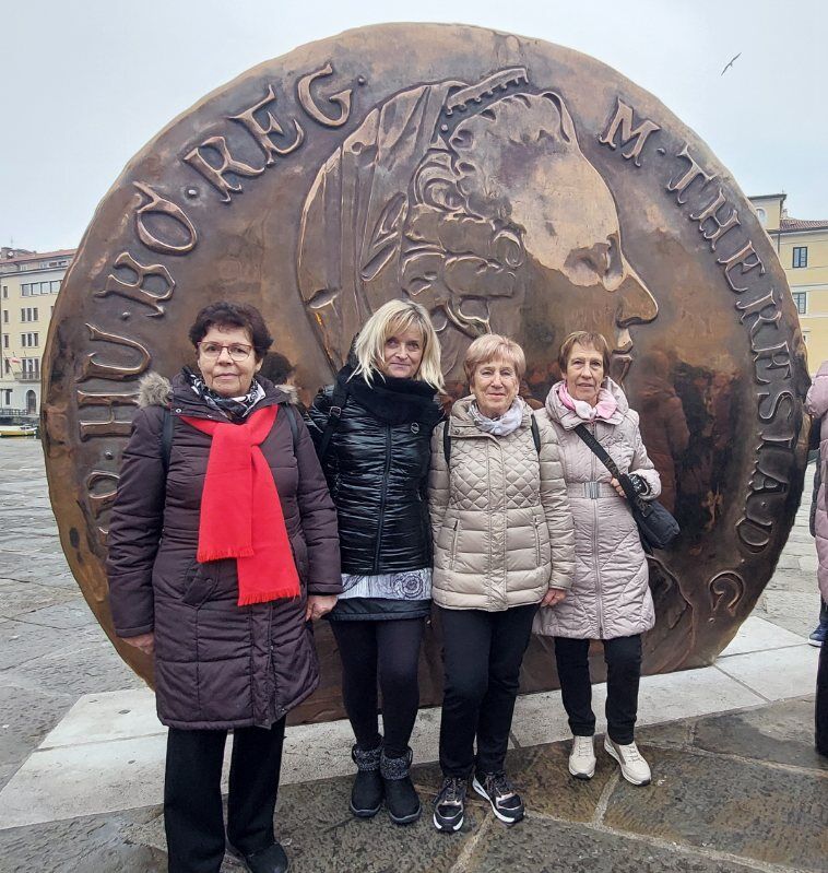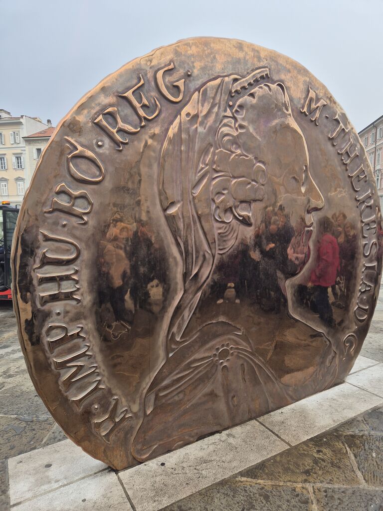 Čeprav je Marija Terezija pustila v Trstu močan pečat (terezijanska četrt), pa do donedavna ni imela v mestu spomenika. V obliki velikega kovanca (tolarja) so ga postavili na razvpitem Ponterošu, nekdaj pojmu jugo-šverca. Onkraj Velikega kanala, urejenega prav za časa Marije Terezije, nas je pozdravil avtor Uliksesa James Joyce. Zatem smo samo pomahali Mireli, ki je s ponudbo in cenami oblačil skoraj povsem izrinila Kitajce iz mesta, in se z avtobusom prepeljali do Rižarne. V Trstu rojeni vojni zločinec Odilo Globočnik je luščilnico riža pretvoril v peklensko taborišče z edinimi krematorijem v tem delu Evrope.