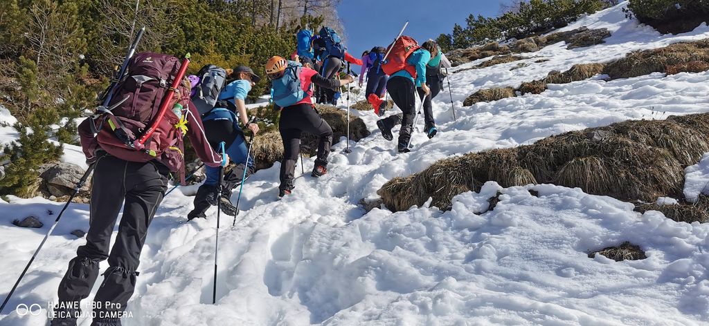 Sonce je že omehčalo sneg, medtem ko smo vijugali mimo macesnov, se je naš korak vedno bolj udiral. Macesni pa so nam, medtem ko smo se prebijali iz snega, nudili le razgled na jasno nebo. Pod Lipanskim vrhom smo zavili desno in se še bolj zagrizli v klanec. Klepet tudi v strmini ni potihnil, čeprav nam je fitnes na odprtem vzel kar veliko energije, a povrnila nam jo je dobra družba, od študentov do seniorjev, in tudi pridruženih članov iz drugih planinskih društev; vedno bolj samo se poznali in tudi tem za pogovor je bilo vedno več. Kar naenkrat se je pred nami odprl pogled mimo vrha Brda na Rjavino. Po nekaj korakih pa tudi na mogočni Triglav, ki je kraljeval nad dolino Krme. Naš pogled je obstal, prav tako naš korak. Nekaj trenutkov smo v tišini le opazovali lepote našega sveta in bili hvaležni. Klici obeh vodnikov, vsakega na enem koncu so nas zbudili; a spomini pred tako lepo kuliso so tudi neprecenljivi. Sneg se je na vrhu grebena manj udiral, a zaradi varnosti smo naredili dodaten vzpon čez Okroglež, od koder se nam je odprl pogled na naš cilj.