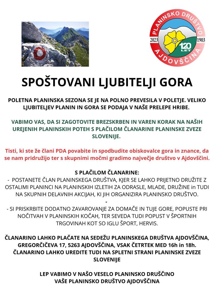 ČLANARINO LAHKO PLAČATE NA SEDEŽU PLANINSKEGA DRUŠTVA AJDOVŠČINA, GREGORČIČEVA 17, 5263 AJDOVŠČINA, VSAK ČETRTEK MED 16h in 18h.