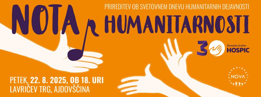Slovensko društvo Hospic in Glasbeno društvo NOVA ob svetovnem dnevu humanitarnih dejavnosti prirejata v petek, 22. avgusta na Lavričevem trgu v Ajdovščini prireditev z naslovom Nota humanitarnosti. Z njo želijo osveščati o različnih stiskah ljudi in ljudeh, ki jim priskočijo na pomoč. Pogosto ne vemo, kje poiskati pomoč in kakšne oblike podpore so nam na voljo, zato je pomembno, da se o tovrstnih tematikah pogovarjamo na zanimiv in sproščen način.