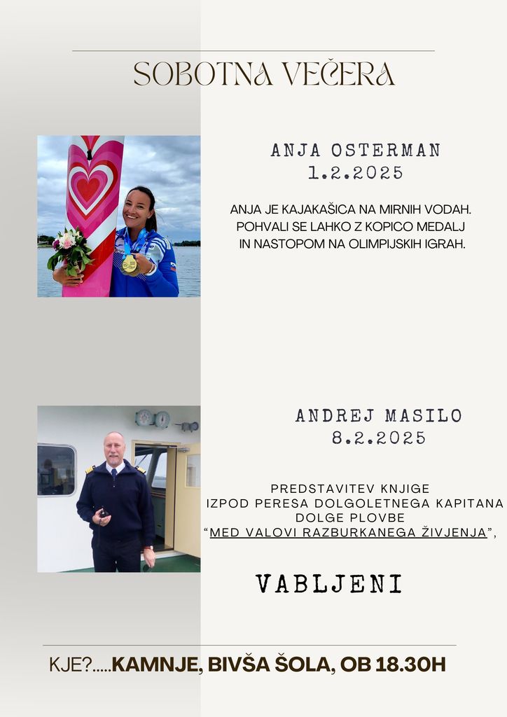 Športno kulturno turistično društvo Kamnje-Potoče ob kulturnem prazniku prireja kar tri pogovorne večere, ki bodo potekali tri soboto zapored v prostorih KS Kamnje-Potoče ob 18.30. Najprej bo v soboto, 25. januarja, gostoval Samo Rovan, svetovno znani poročni fotograf, po rodu iz Vrhpolja. V soboto, 1. februarja, bodo gostili vrhunsko športnico Anjo Osterman, kajakašico na mirnih vodah in olimpijko, na praznično soboto pa še Andreja Masila iz Ajdovščine, dolgoletnega kapitana dolge plovbe. Pogovor bo tekel o njegovi najnovejši knjigi in o poklicu mornarja na splošno.