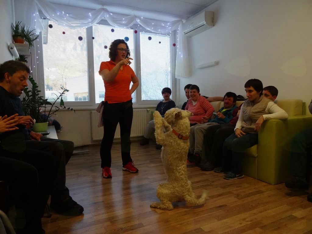 Prav tako nas je enkrat mesečno obiskoval terapevtski par iz društva Ambasadorjev nasmeha, Ana Boštjančič in njen pes Bono. Poudarek ni bil na terapiji, ampak na druženju z živaljo in na aktivnosti z njo.